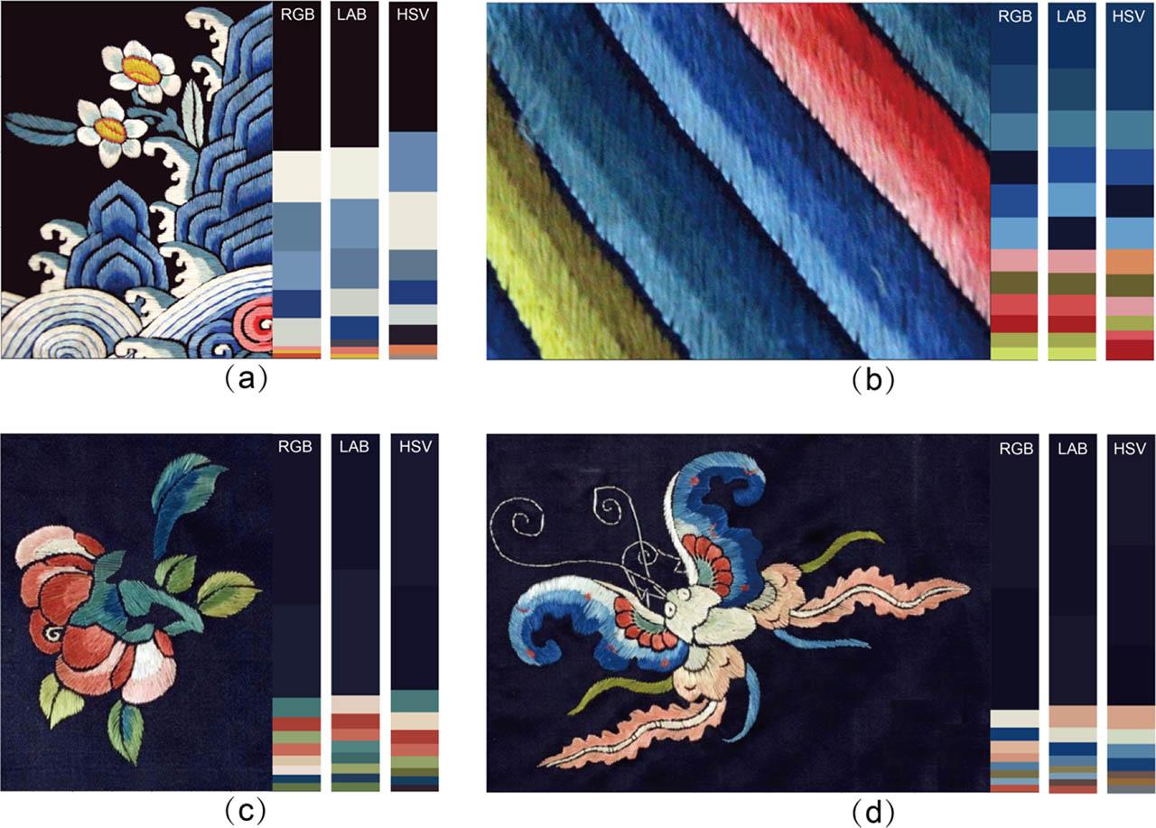 Colour extraction experiments from multiple embroidery images in RGB, HSV and LAB colour spaces were conducted using K-means++ clustering. Results show the RGB space is more suitable for the colour extraction of ancient Chinese embroidery images (Figure 14).
