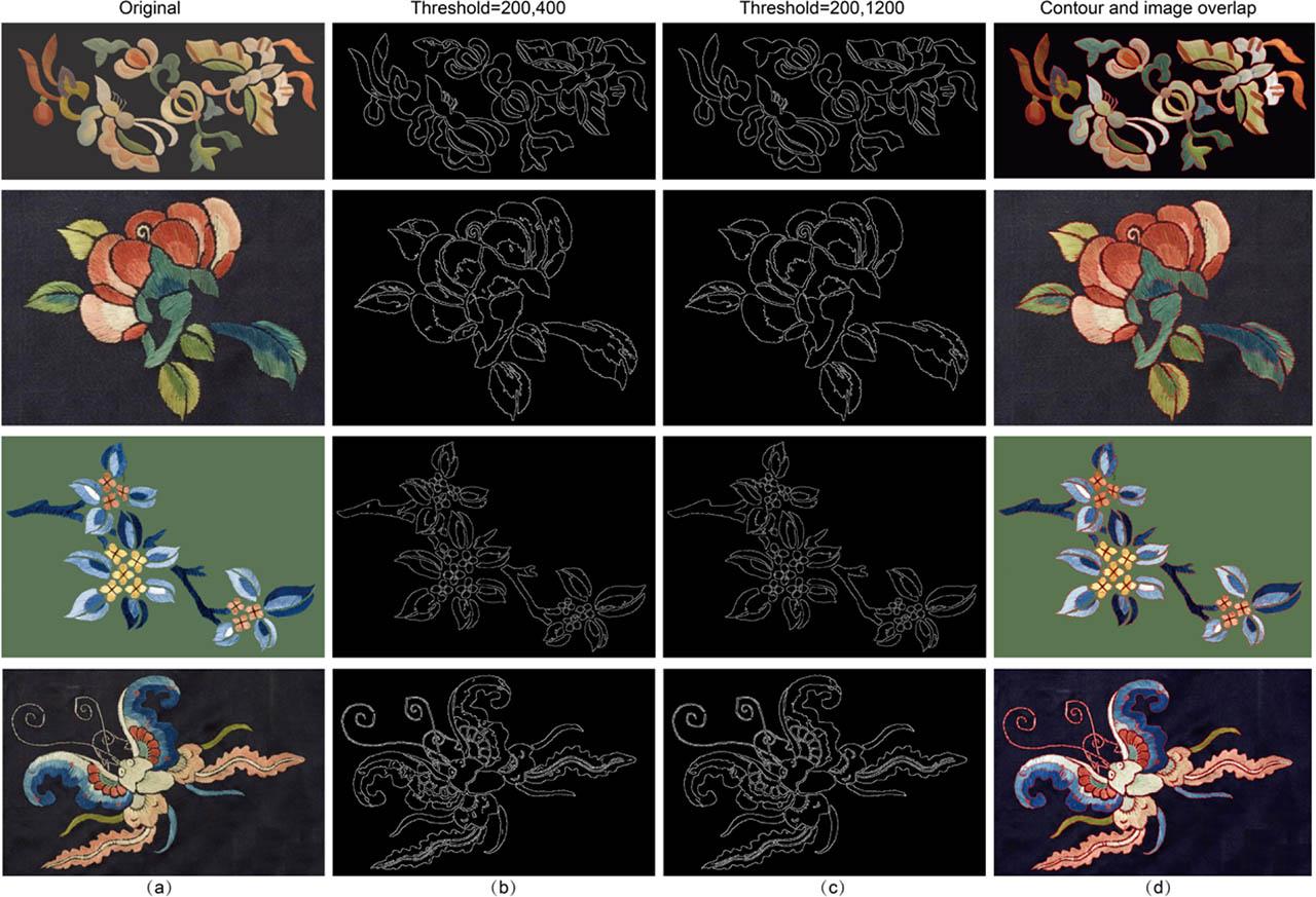 This study discussed whether colour level adjustment and sharpening should be added to the preprocessing. The colour and contour extracted from embroidery images were optimised at a high threshold =1200 and low threshold =200 of the Canny operator. Therefore, the new method can effectively extract the colours and contours of ancient Chinese embroidery patterns at low calculation cost. It lays a foundation for digital storage and innovative application of embroidery patterns.