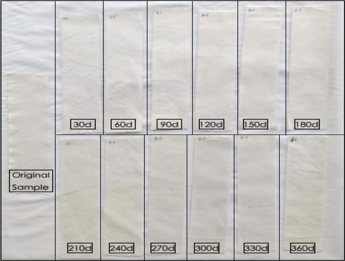 Natural-coloured stock fabric samples in a natural environment (original sample + 12 pieces of different storage time) (Source: author's)