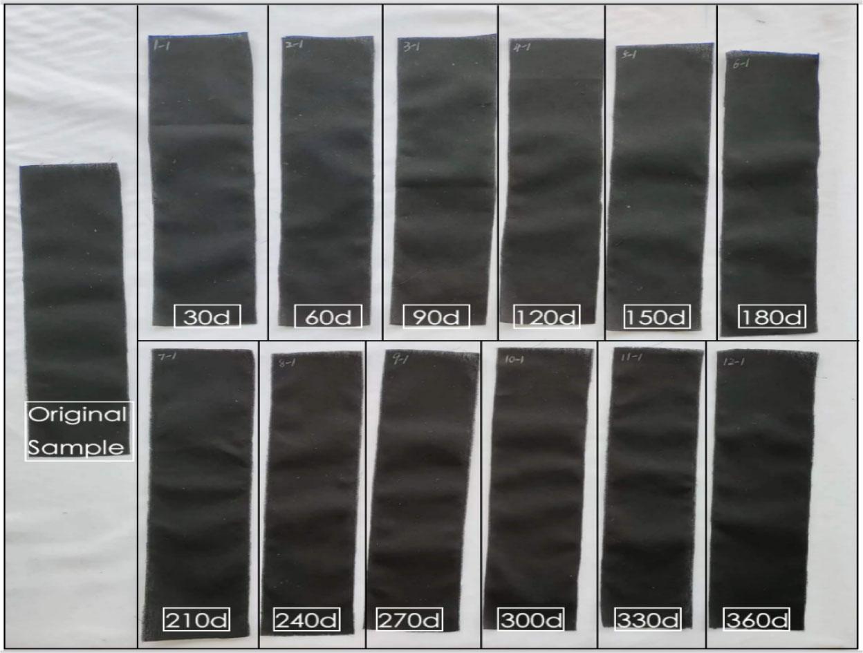 Figure 2 shows black-coloured stock fabric samples in a natural environment. There are a total of 14 pieces: one piece of the original sample and 12 pieces of different storage times. We can see that there is no apparent change in the appearance of the fabrics despite increasing storage times.