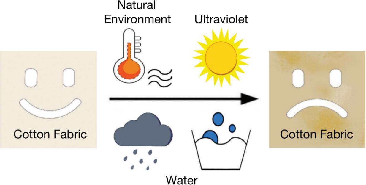 Figure 3 is a sample graph showing three factors affecting the physical properties of cotton stock fabric: light and heat from the natural environment, UV rays from the sun, and rain.