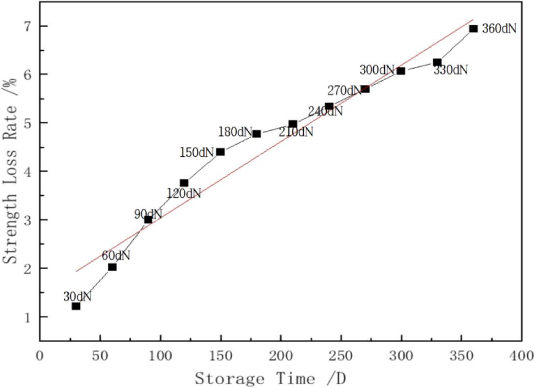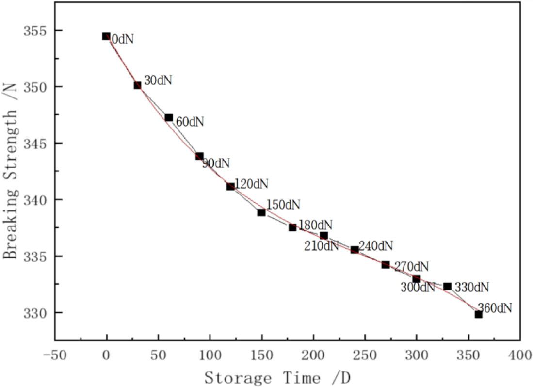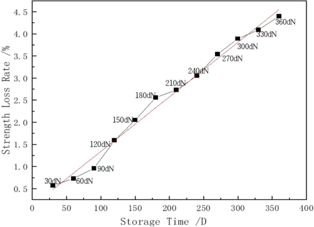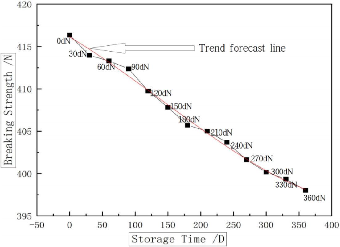 There are many kinds of stock fabric strength, including tearing, bursting, joint, joint slip, peel joint slip, and peel strength. The most important among them is the tensile breaking strength, which is one of stock fabric's major indexes of its physical properties. Because stock fabric stored over the long term is affected by various factors such as temperature, humidity, and inventory time, the physical properties of stock fabric are reduced along with its service life. In this part, the tensile strength of the stock fabric was used as a reference index to analyze the change rule of the strength of the stock fabric stored in a natural environment, which is of great significance to the preservation of the stock fabric.
