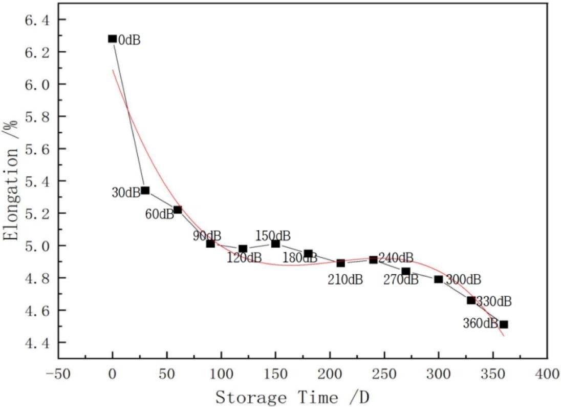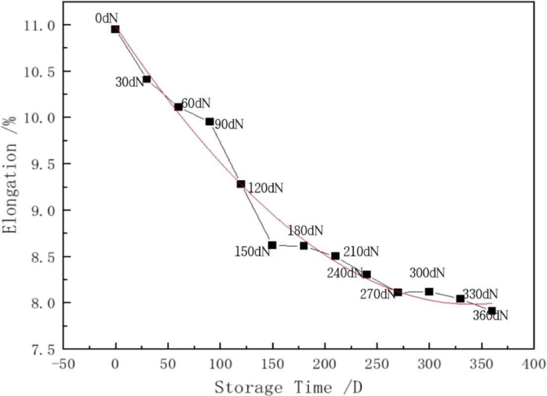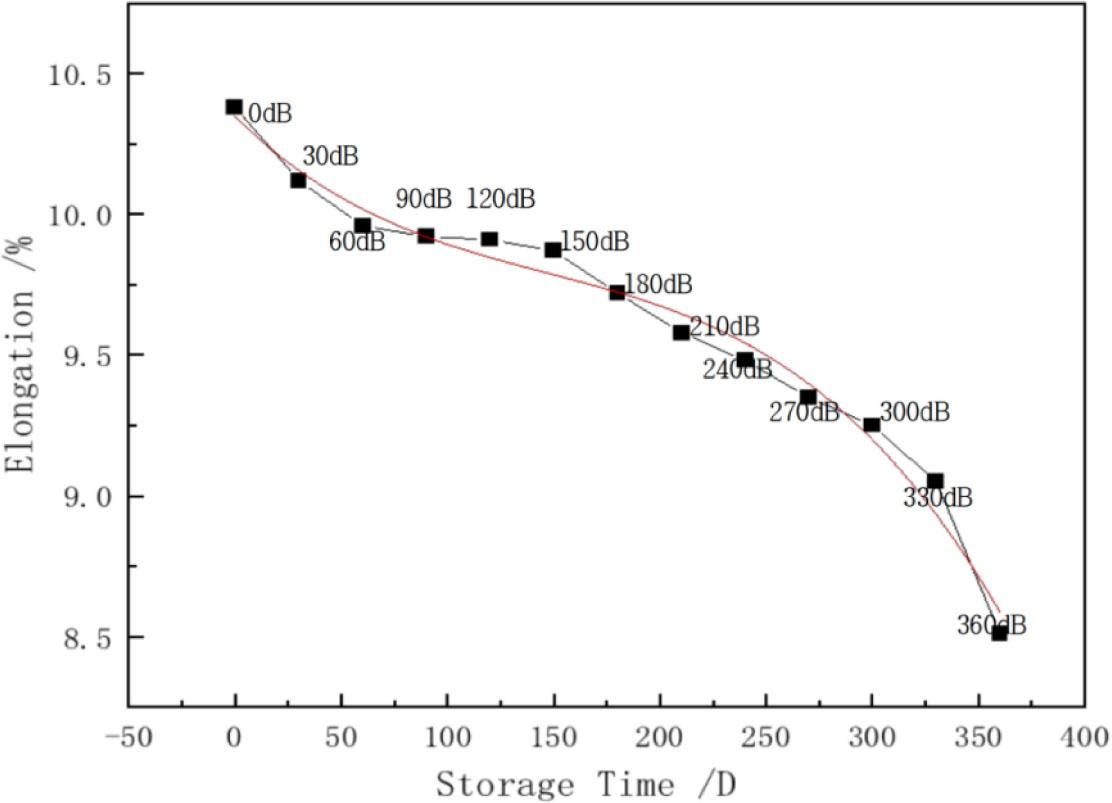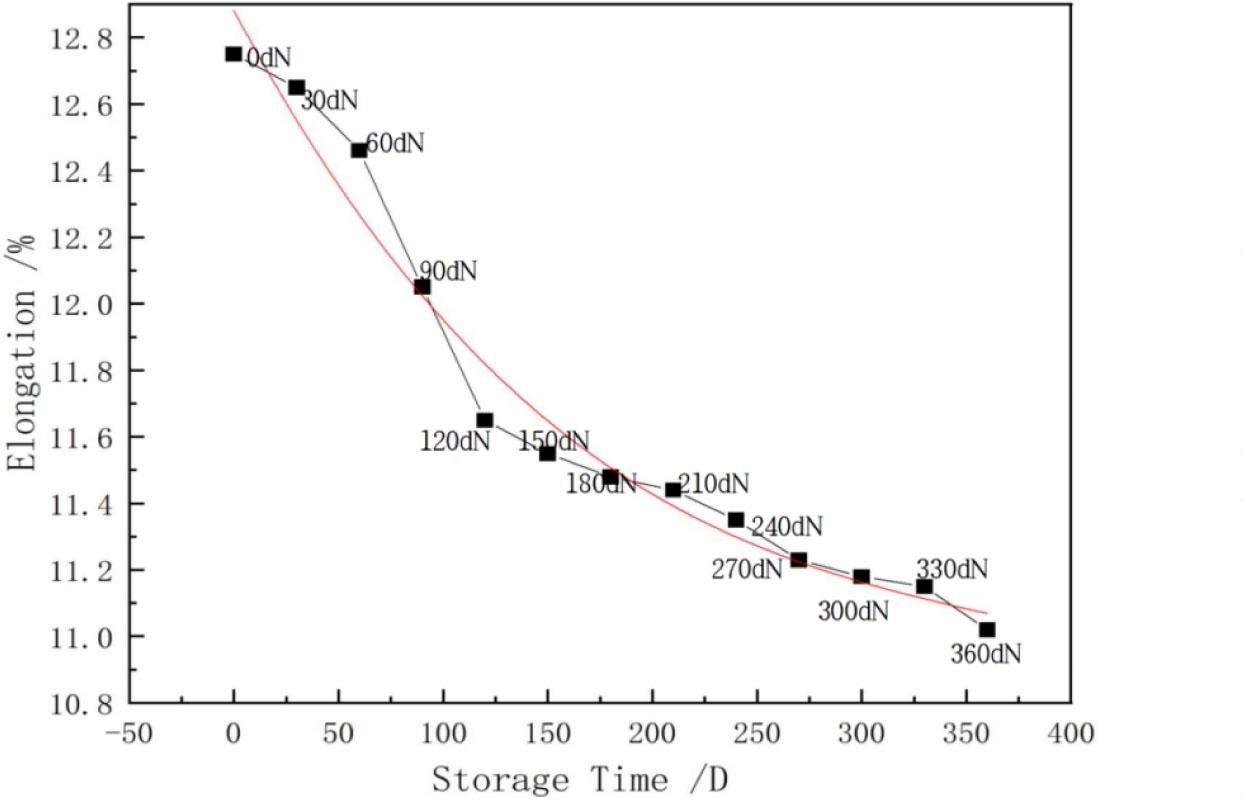 Figure 5 shows the relationship between the warp elongation and storage time of natural-coloured cotton stock fabric in a natural environment. The graph shows that the elongation rate decreases rapidly from about 50 days to 150 days, but the trend becomes slower and relatively stable after 150 days.