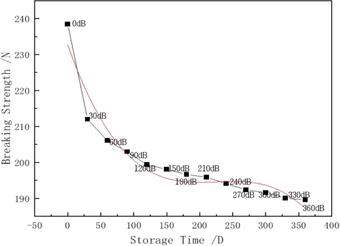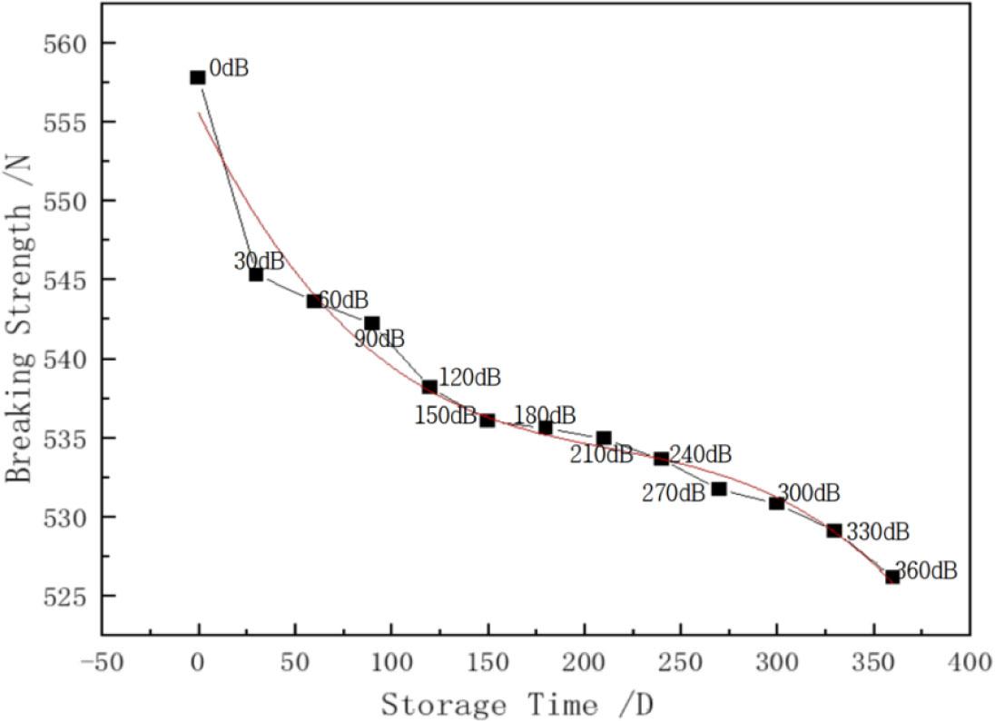 The curve of weft-breaking strength of natural-colour stock fabric with storage time and fit polynomial (Source: author's own)
