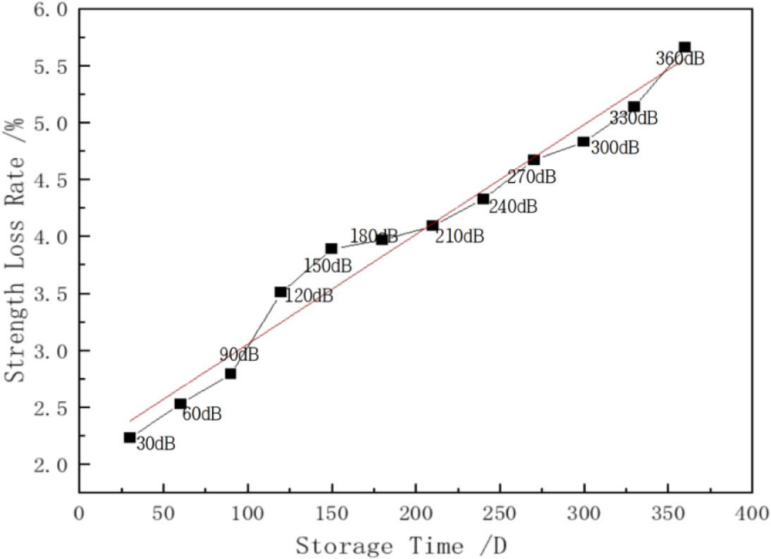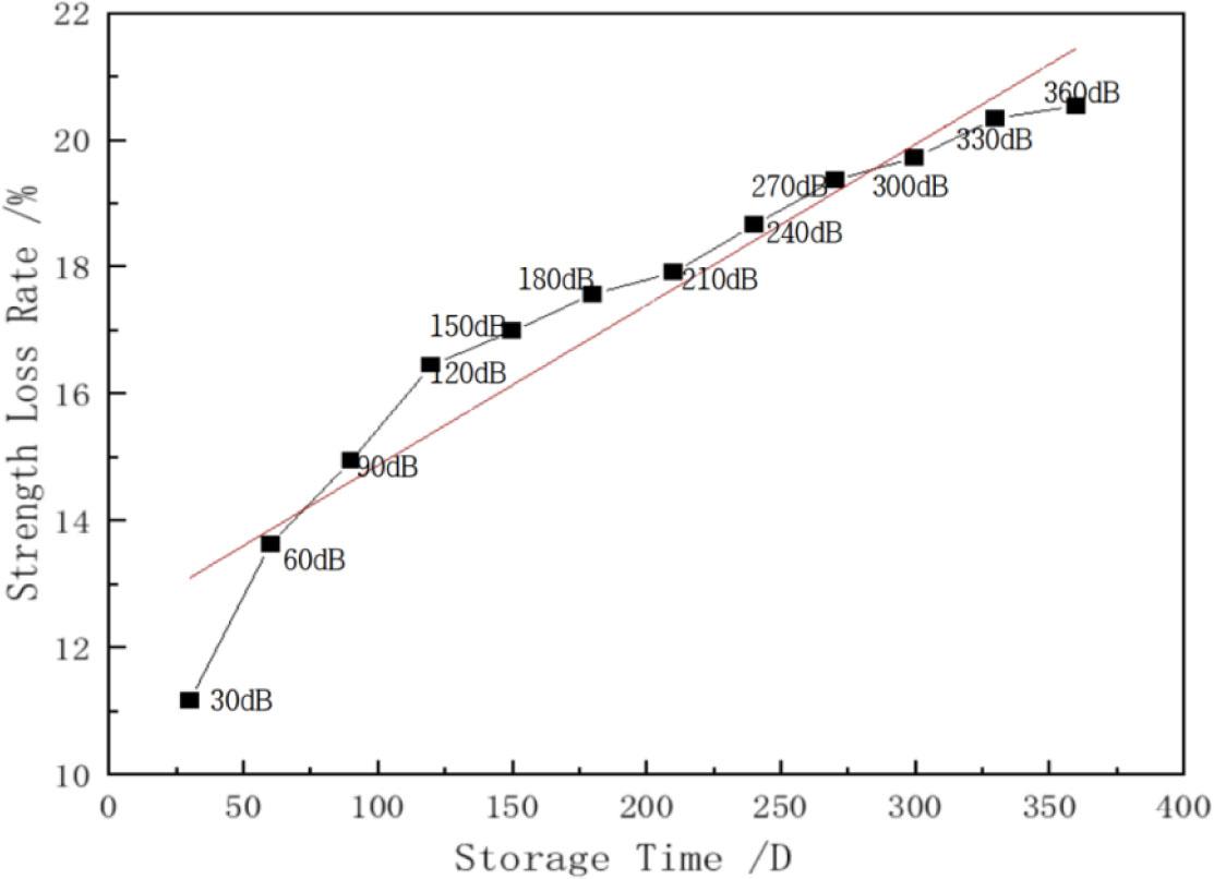 Figure 15 shows the relationship between the weft strength loss rate and storage time for black stock fabric in a natural environment. We can see that there is a rapid increase in the strength loss rate for the first 120 days of storage. However, thereafter days the strength loss rate gradually slows down.