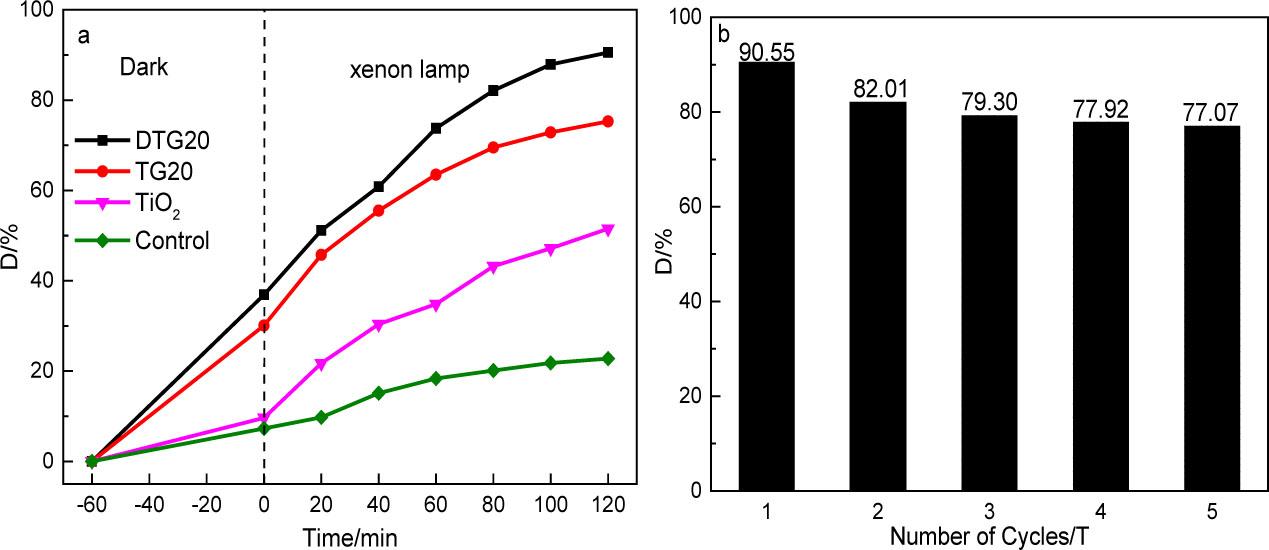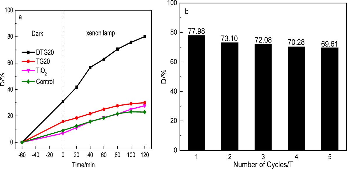 In order to degrade the MB pollutant thoroughly, a compounding method was used to treat the cotton fabric using DTG20 and its intermediates. The photocatalytic degradation efficiency of MB of the finished cotton fabric treated with the compounding method is shown in Fig. 5. The degradation efficiencies of MB of finished fabrics treated with DTG20, TG20 and TiO2 through the compounding method were all higher than those by the coating and padding methods only, and the removal rate of MB was 90.55%, 75.27% and 51.50%, respectively. At the same time, cycling experiments were performed on the cotton fabric treated with DTG20, the results of which are shown in Fig. 5b. It can be seen from Fig. 5b that after performing the 4 cycle experiment, the removal rate of MB could still reach 77.07%.