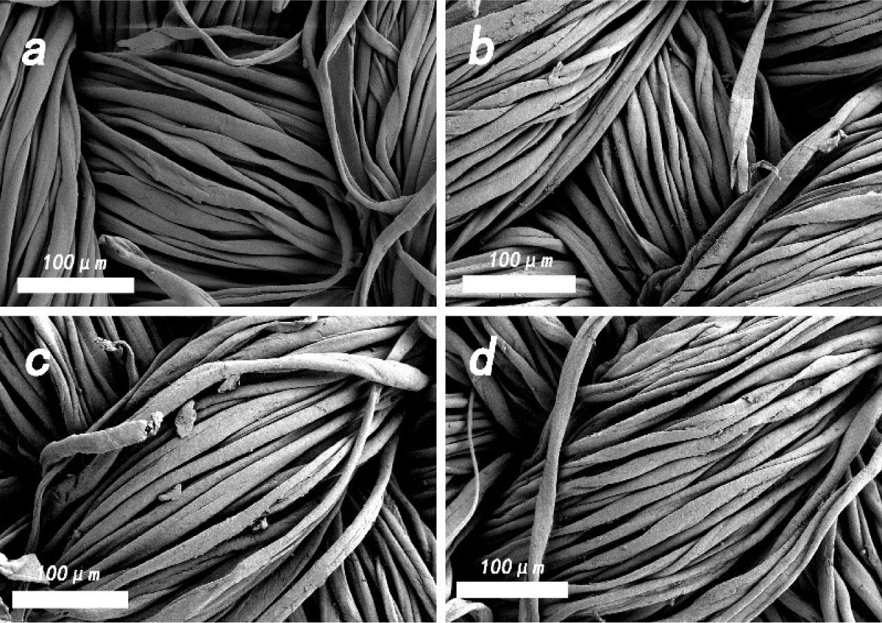 SEM images of fabrics: control cotton fabric(a), DTG20 fabrics treated by padding method prior(b), and after treating MB pollutant the 1st time(c) and the 5th time(d).