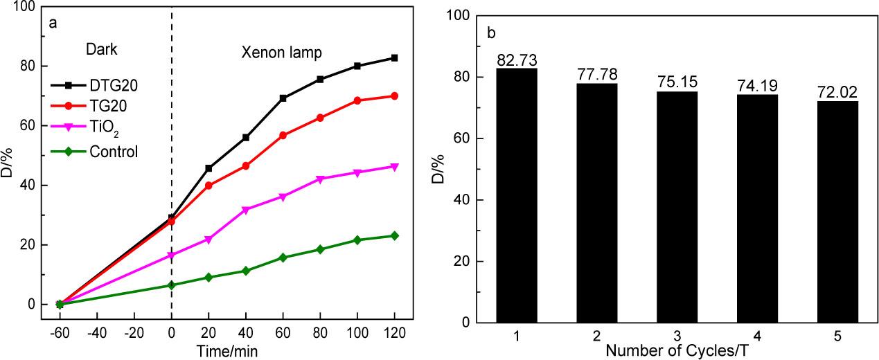 K/S of DTG20 treated fabric (a) after performing photodegradation experiment (b) decline rate under xenon lamp irradiation