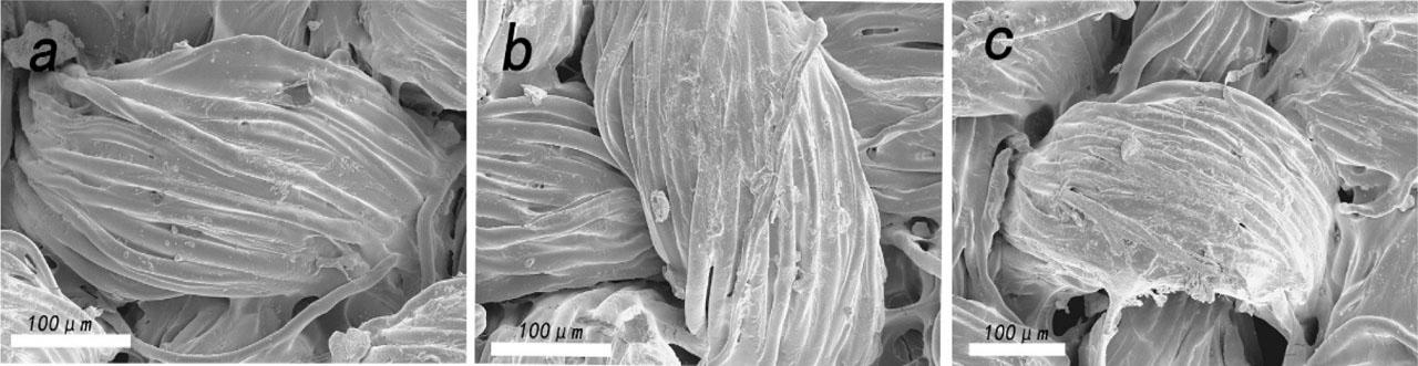 In addition, we can also see from Fig. 1b that the photodegradation efficiency of MB by cotton fabric finished with DTG20 decreased as the number of cycle times increased; but after four cycles, the removal rate of MB could still reach 69.61%. The morphologies of the control cotton fabric treated with DTG20 before and after performing photodegradation experiments are shown in Fig. 2. It can be seen from Fig. 2 that the control cotton fibres were flat, smooth and showed a ribbon-like style with natural twists. The surface of the fabric treated with DTG20 was a little rough and presented small granular protrusions, indicating that the finishing agent had bonded or accumulated on the surface of the fabric[18]. After treating the MB sewage, the granular protrusions on the surface of the finished fabric became less, but the overall change was very small, indicating that the DTG20 had bonded on the fibre through hydrogen-bonding and Van der Waals forces. The reason for the decrease in the photodegradation efficiency of MB as the number of cycles increased may have been that a very small amount of DTG20 had fallen away from the fabric. Furthermore, the finished fabric absorbed a large amount of MB molecules during the degradation process, which are difficult to be degraded completely in a limited time, thus remaining on the surface of the fabric and forming a coverage layer on the surface. This will weaken the absorption and utilisation of illuminants by the photocatalyst and cause a decrease in the degradation efficiency, which trend will increase with the increasing of cycling times.