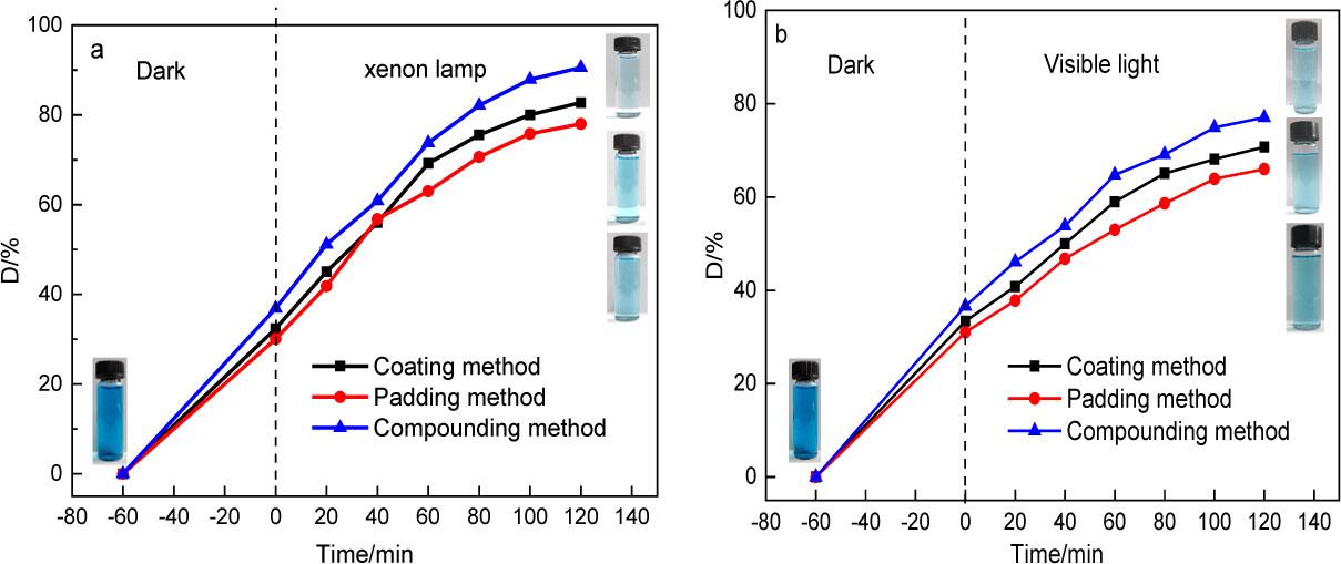 Different light sources were used in the treatment of MB pollutants. The photodegradation efficiency of MB treated by DTG20 finished fabrics using different treatment methods is shown in Fig. 6a, which shows that the fabric treated with the compounding method under a xenon lamp had the best MB photodegradation effect, and the removal rate of MB reached 90.55%. Moreover, the treated MB pollutant became colourless. Whereas the cotton fabrics treated by the coating and padding methods had an MB degradation efficiency of 82.73% and 77.98%, respectively, and the treated MB pollutants were still light blue, indicating that an amount of MB remained in the water. To figure out the ultraviolet light effect on the photodegradation of MB, a slice of glass was placed on the apparatus containing the pollutant, which could shield from the ultraviolet light from the xenon lamp. The photodegradation efficiency of MB under visible light is shown in Fig. 6b. It can be seen from Fig. 6b that the photodegradation efficiency of MB under visible light decreased a little as compared to that under a xenon lamp; but the treated fabrics still presented good photodegradation capability.