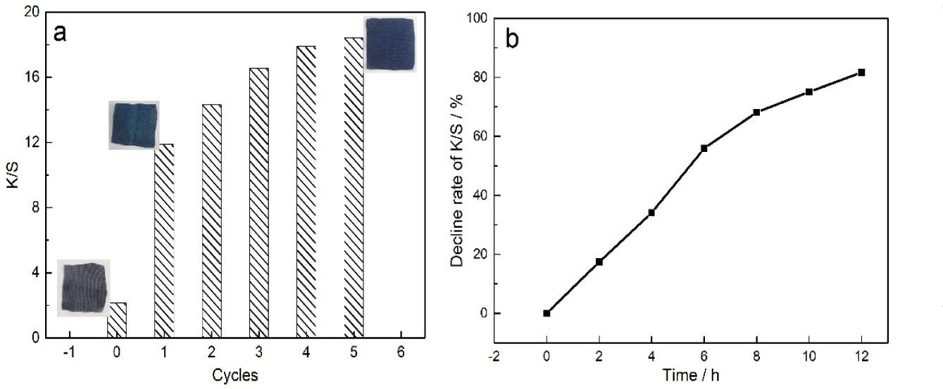In an attempt to understand the adsorption of MB molecules on the surface of DTG20 treated fabric after performing the photodegradation experiment, the K/S value was tested, the results of which are shown in Fig. 7a. It can be seen from Fig. 7a that as the number of cycles increased, the K/S value also increased, suggesting that the MB molecules had been adsorbed on the surface of the DTG20 treated fabric. After five cycles, the K/S value increased from 2.145 to 18.433 and the appearance of the DTG20 treated cotton fabric changed from grey to dark blue. This is also proof of a decrease in the photodegradation efficiency of MB as the number of experiment cycles increased. For further application of this fabric, the MB molecules absorbed should be removed as much as possible; hence, after performing the photodegradation experiment the treated fabric was put under a xenon lamp for illumination. The discard of MB molecules from the fabric was investigated by testing its K/S c. The graph in Fig. 7b shows that the K/S of the fabric declined a lot as the longer the illumination lasted. After 12 hours of illumination, the K/S value declined by 81.66% according to equation (1-2). It can be inferred that the DTG20 treated fabric exhibited excellent self-cleaning performance. When being exposed to sunlight, most of the remaining MB molecules on the fabric sample degraded and fell away.