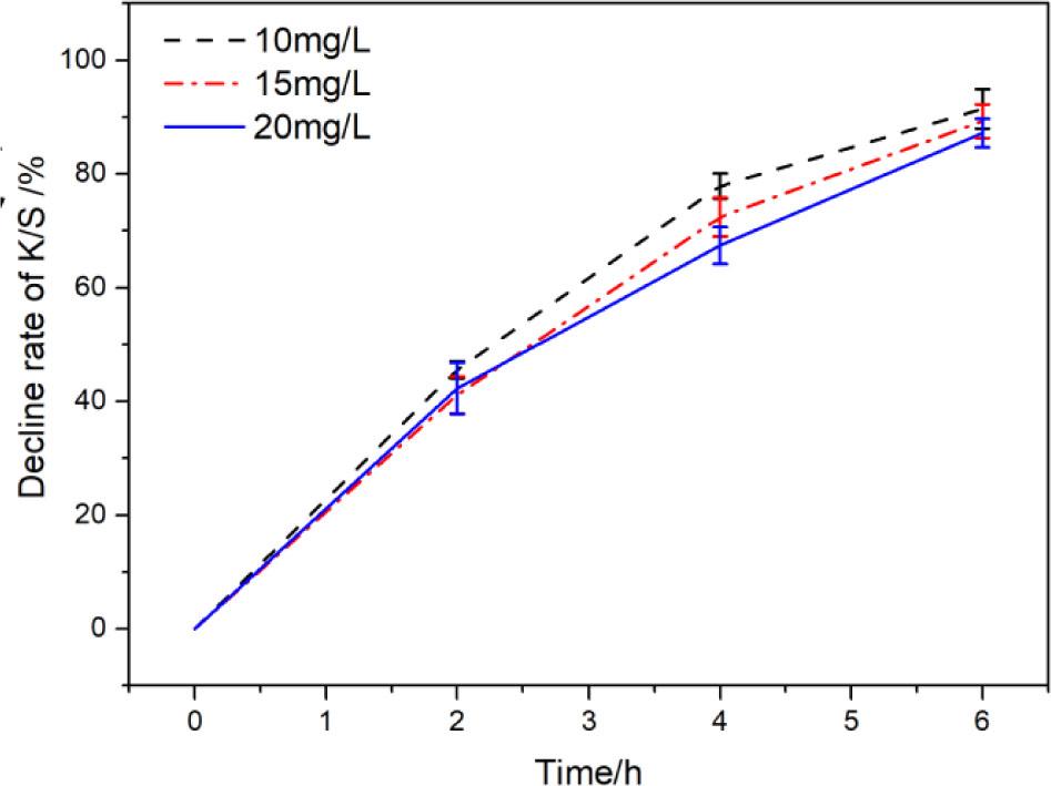 To study the self-cleaning effect of DTG20 treated fabric, an actual experiment was conducted for stained fabric under natural sunlight, where the decline rate of the K/S value for the fabric was counted. The result is shown in Fig. 8. It can be seen from Fig. 8 that as the illumination time prolonged, the decline rate of K/S increased, while as the concentration of MB increased, the decline rate of K/S decreased a bit. When the MB concentration is 10 mg/L, the MB removal rate on the fabric can reach 91.44%. This may be associated with the amount of photocatalyst finish on the fabric and the photodegradation ability of MB being the same. When the concentration of MB was bigger, the K/S of the fabric was higher, leading to a lower value of the K/S decline rate.