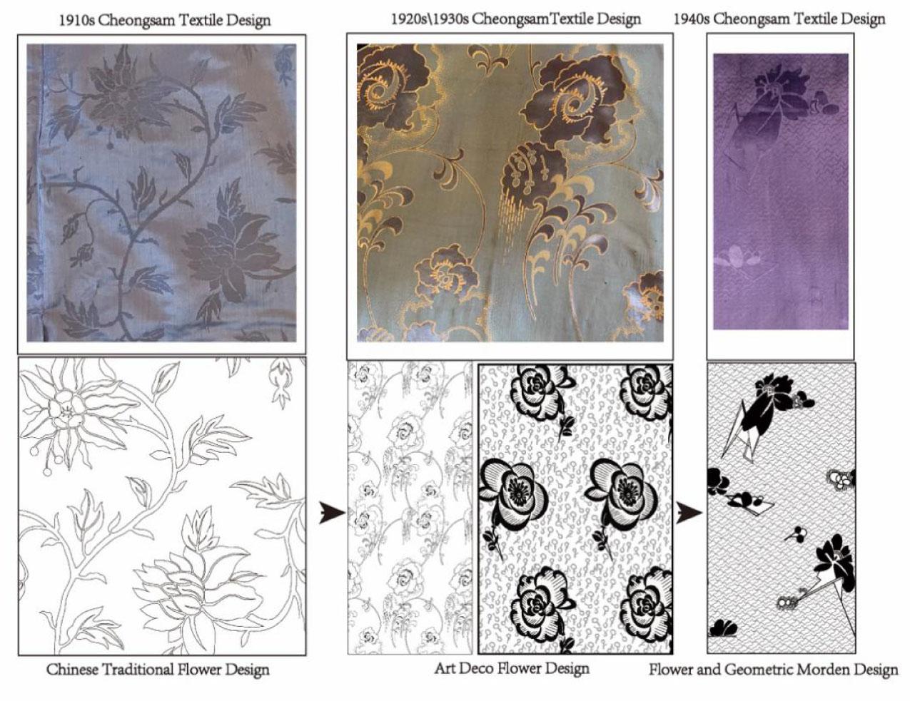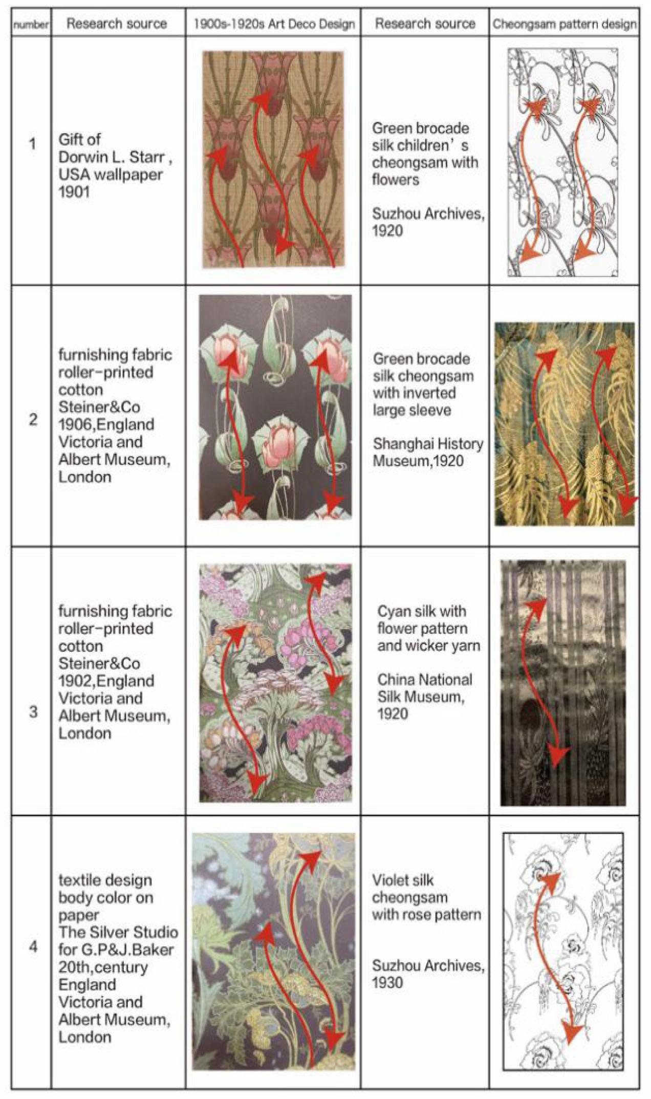 S-style design comparison: Western patterns and cheongsam patterns of the Republic of China (1900s–1930s) (Drawn by the Author)