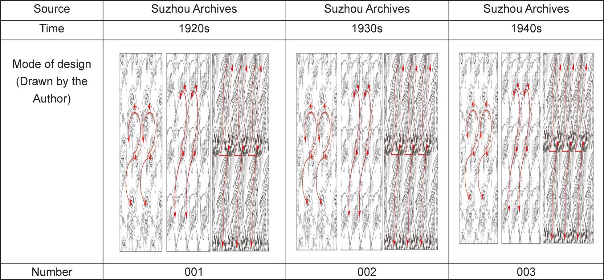 During the Art Nouveau era, the countries had shared common laws in art design, such as the description of natural plants and flowers, the use of fluid curves, or ideas borrowed from Japanese Ukiyo-e art. However, there also existed differences in artistic design during various periods and in different regions. For example, regions such as France, England, and Belgium focused on the manifestation of “decorativeness”, while regions like Germany, Vienna, Scotland, and Austria were more characterized by early modern art, obviously featuring “modernity”[3]. In terms of pattern style, the Republic of China's cheongsam changed from highly decorative floral embroidery to predominantly dark jacquard patterns. The jacquard pattern itself was also influenced by Art Nouveau and the decorative arts and underwent a gradual transition from the art Nouveau style S-curve abstract natural object to the natural flower and Combination pattern form of abstract geometric lines. From the restored cheongsam patterns of the early 1920s, it can be seen that through the reorganization and deformation of lines, flowers and plants formed new Art Nouveau abstract flower patterns, and the lines became S-shaped curves, which were smoother and typical of the Art Nouveau style (Figure 2).