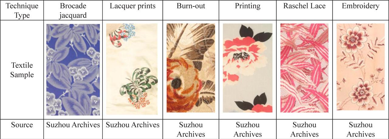Among the 259 pieces of cheongsam samples collected, the authors extracted various technique types for summary and analysis and found that there was a visible increase in technical types among the cheongsams made after 1930, compared to the period from 1920 to 1930. Part of the pattern technique for cheongsam is indicated in the following figure: brocade jacquard, lacquer print, burn-out, print, embroidery, lace, etc. In contrast, the cheongsam made from 1910 to 1920 mostly used the traditional technique of brocade jacquard, which indicated that the popularity of the cheongsam technique type was closely related to increased industrialization in modern China.