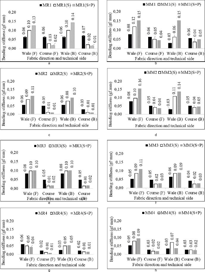 The bending stiffness of the half-Milano rib knit fabric was lower for the back side (B) of raw (MM1, MM2, MM4) and treated MM1(S), MM4(S) and MM4(S+P) samples than for the face side (F) of the samples in wale direction. However, the bending stiffness was almost independent on the technical side for the MM3, MM2(S), MM3(S), MM1(S+P), MM2(S+P), MM3(S+P) and MM4(S+P) samples in the wale direction and for the raw sample (MM1, MM2), and for the treated sample in course direction. The bending stiffness for the face side (F) of raw samples (MM3), treated MM1 (S), MM4 (S), and MM1 (S+P) in the course direction were higher than for the back side (B). The stiffness of the bending of the half-Milano rib knitted fabrics was higher in the wale direction than in the course direction in raw and treated samples, except for MM2 wale case (B) (Figure 6 (b, d)). Softening and dyeing and antibacterial finish increased the bending stiffness of MM1(S), MM2(S), MM3(S), MM4(S), MR1(S+P), MM2(S+P), MM3(S+P) and MM4(S+P) fabrics in the wale direction but decreased it in the fabric course direction. The bending stiffness of the 1×1 rib knitted fabric samples (Figure 6 (a, c, e, g)) was lower than those of the half-Milano rib knit fabric samples (Figure 6 (b, d, f, h)) for most of the treated fabric samples investigated.