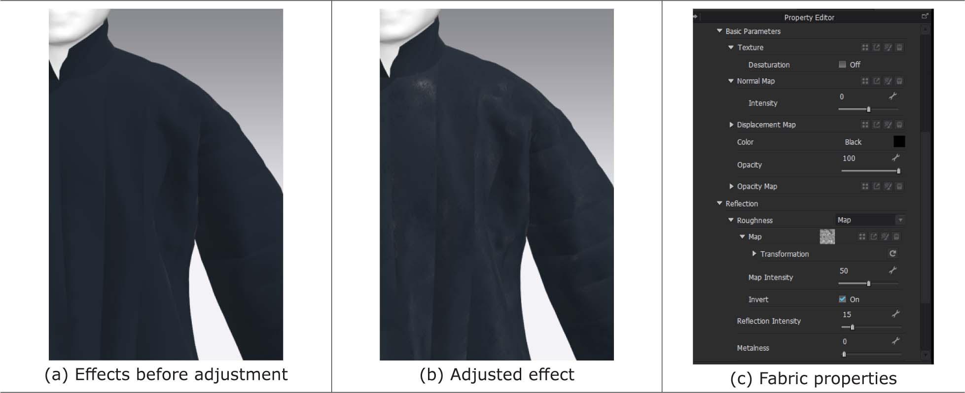 | Virtual clothes | Complete restoration of the structure of the garment, cross-plane structure, one-piece with sleeves | The virtual effect of the quilting process and the cotton wool filling effect are realised, and the one-word button structure is restored. | The fabric is recovered from black plain cotton, adjusting the relevant properties and lustre so that it is infinitely close to the texture of the actual fabric. | The overall silhouette of the virtual fitting is consistent with the real thing, and the pressure test results are reasonable. |