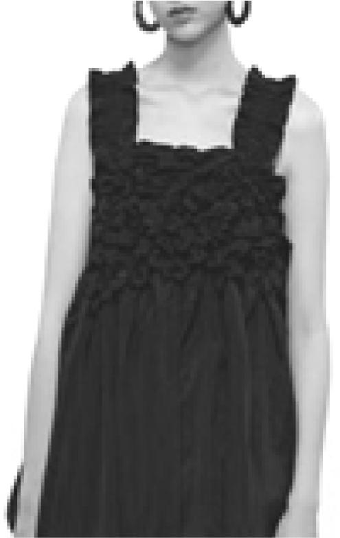 The smocking craft usually appears in the style of trousers, skirts and tops in the overall shaping [16]. In the design of local brands, the form of smocking technology is divided into single pleat repeated application (see Figure 7) and pleat split application (see Figure 8). Single repeated use refers to the use of the same smocking technique in the overall shaping of the clothing according to the design requirements, which has certain regularity in the visual expression effect. Split-type smocking needs to design the overall shaping of the garment in advance from the combination method and division ratio, fully considering the expression form of smocking craftsmanship in the whole garment. Clothes made by smocking technology as a whole can improve the wearer’s comfort; but since smocking technology occupies a larger area, the time and difficulty of the manufacturing process will increase.