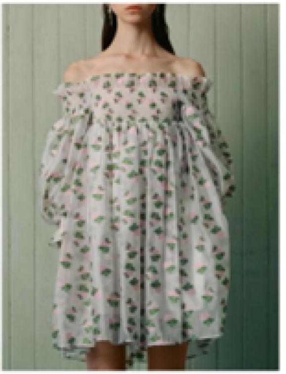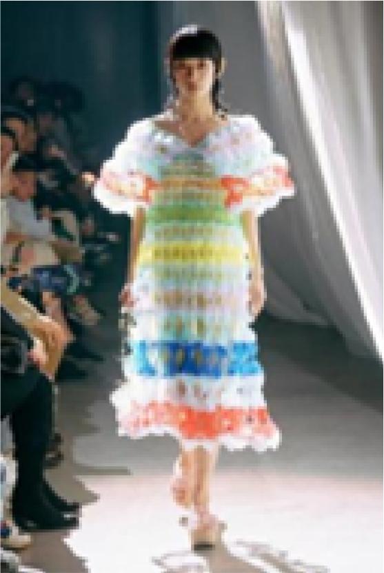 Applying color to the smocking craft, breaking through the arrangement of traditional single color, can make the effect of smocking more obvious, and the whole garment has more rhythm and sense of rhythm [20]. In the SUSAN FANG 2021 autumn and winter series, Chinese designer Fang Yannan vividly combined colored ribbons and mesh through the Smocking technique, as is shown in Figure 17.