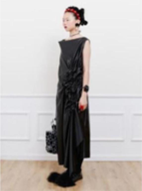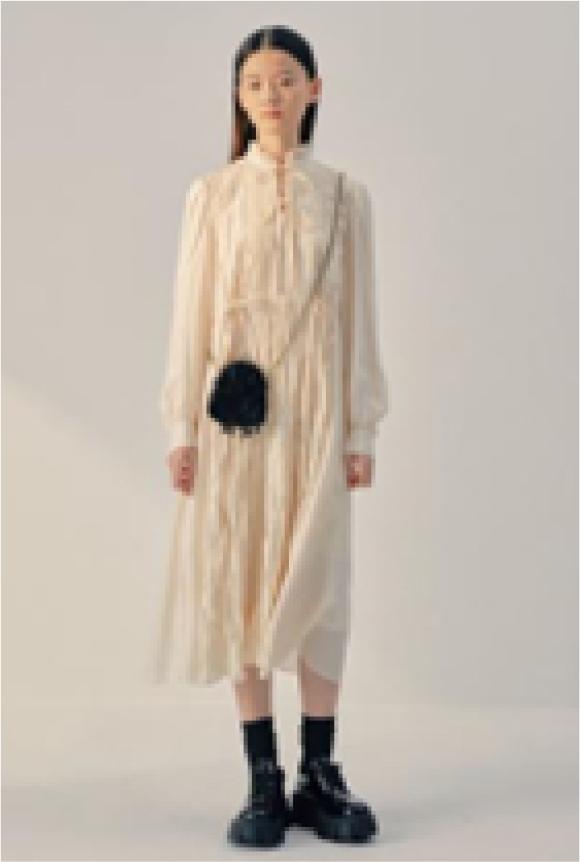 In the Marchen 2021 spring and summer series, Chinese designer Chen Mei added beading on the basis of direct smocking for embellishment, as is shown in Figure 6, which responds to the black skirt, demonstrating a smart girl with a little dark style and an eclectic sense of personality.