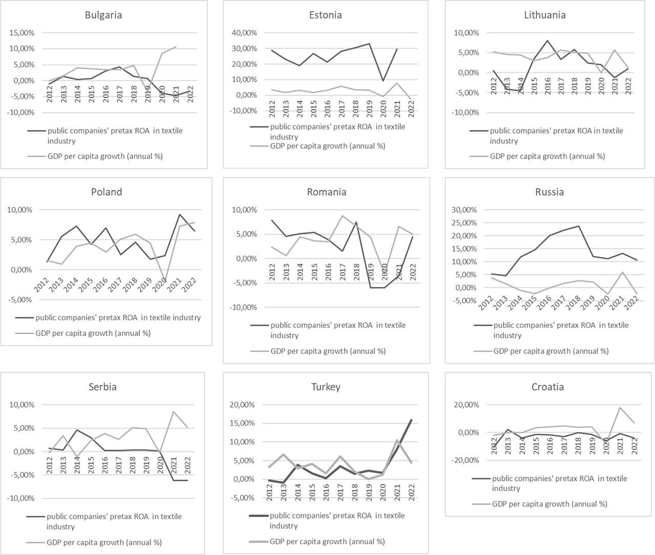 For most of the countries analyzed, there is a direct correlation between public companies' pretax ROA in the textile industry and GDP per capita growth, which is in line with the results of other previous research. In most cases the strength of the link between the two indicators is strong.