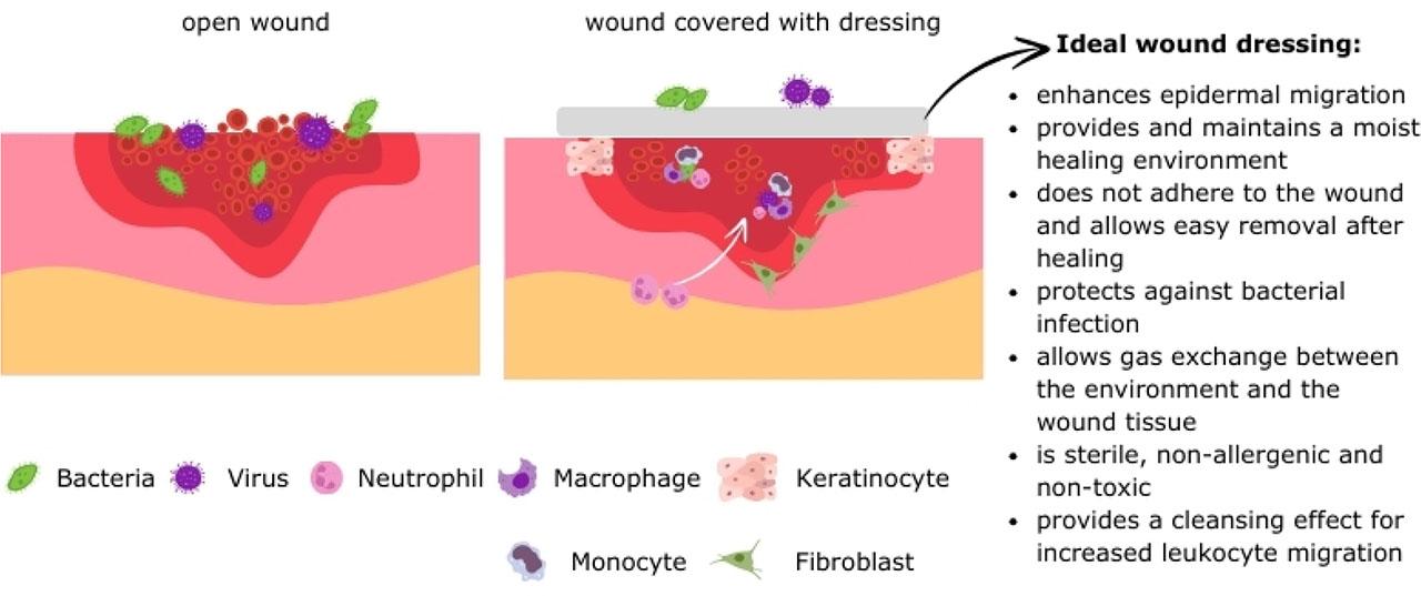 Wound dressings are materials applied to wounds to promote healing, preventing infection and protecting from further injury. Depending on the application, they are available in many forms and types, each with various functions [1]. The primary purpose of a dressing is to create an environment that promotes wound healing, supports healthy cell growth, and facilitates the healing process (Fig. 1) [2]. The frequency of dressing changes depends on the specific condition of the wound, particularly the amount of exudate relative to the dressing's absorbent capacity, with changes typically occurring between 1 day and 1 week [3].