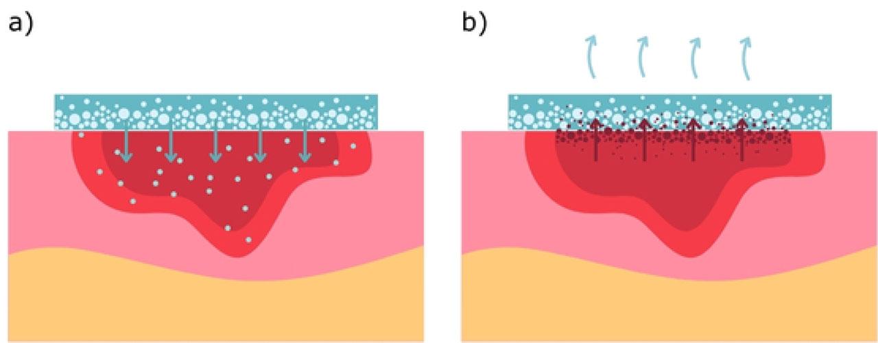 Mode of action of the hydrogel dressing in the case of- a) dry wounds, b) wounds with exudate (figure based on [34])
