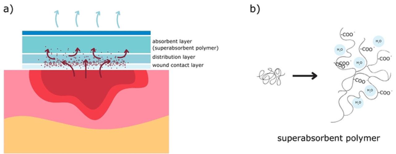 Mode of action of the a) super absorption dressing and b) superabsorbent polymer (figure based on [36])