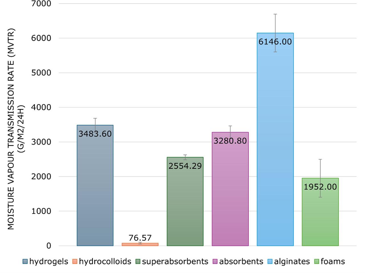 The highest MVTR values were reported for the hydrogel, absorbent and alginate dressings, where values exceeded 3,000 (g/m2/24h). Hydrogel dressings can absorb liquid and then subsequently release it from their structure as vapour. The absorbent dressings can absorb moisture vapour but partially retain it in their structure. Alginate dressings are based on alginate, which has absorbent properties. The lowest value of MVTR was reported for occlusive hydrocolloids [38], which do not allow water, oxygen, or bacteria into the wound. It can be explained by the waterproof barrier on the dressing. Therefore, hydrocolloids should not be placed on heavily exuding wounds due to the risk of maceration. Because of their porous structure [39], foam dressings have the capability to retain moisture vapour and consequently create a moist wound healing environment.