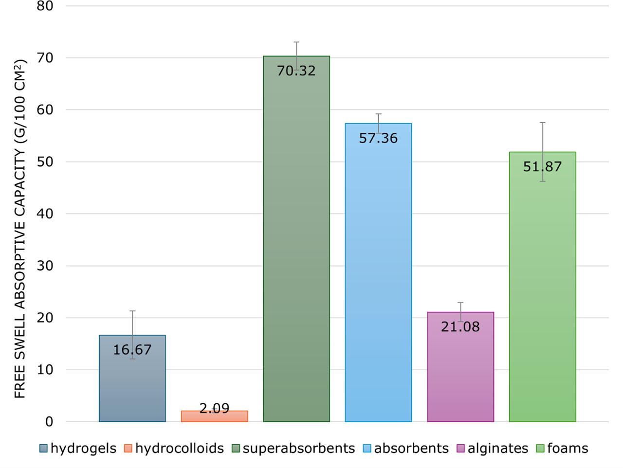 The results of free swell absorptive capacity are shown in Figure 13. The highest value was reported for superabsorbent and absorbent dressings, while hydrocolloids had the lowest free swell absorptive capacity value.