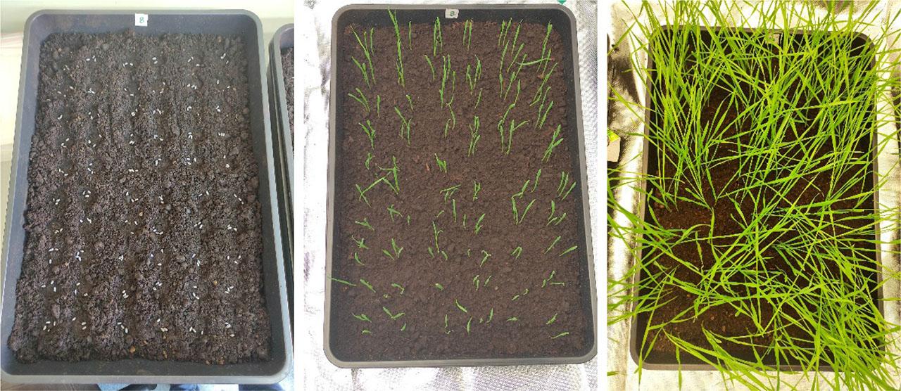 The study was conducted in 2022–2023 at Łukasiewicz Research Network-Lodz Institute of Technology (Łukasiewicz-LIT), in a grow box, RoyalRoom (200×200×100 cm), in Poland under controlled conditions. Winter wheat (Triticum aestivum L.) seeds came from Plant Breeding Strzelce (Poland) and were kept under artificial light conditions (Lumatek Attis 200W LED FULL SPECTRUM ATS200W). The experiment was conducted over a photoperiod of 8 h light/16 h dark, with an approximate day/night temperature of 21/19ºC and 50% relative humidity. The germination rate of the winter wheat seeds was 99%. The seeds were sown in plastic trays filled with universal agricultural soil (pH: 5.5–6.5, EC<1.5 mS/m, organic matter: 2%). The trays were 58×40.5×7cm. Each cultivation tray contained approximately 180 wheat seeds. There were 3 replicates for each preparation and for the control sample (without foliar application). Growth stages of the winter wheat seedlings are shown in Figure 1.