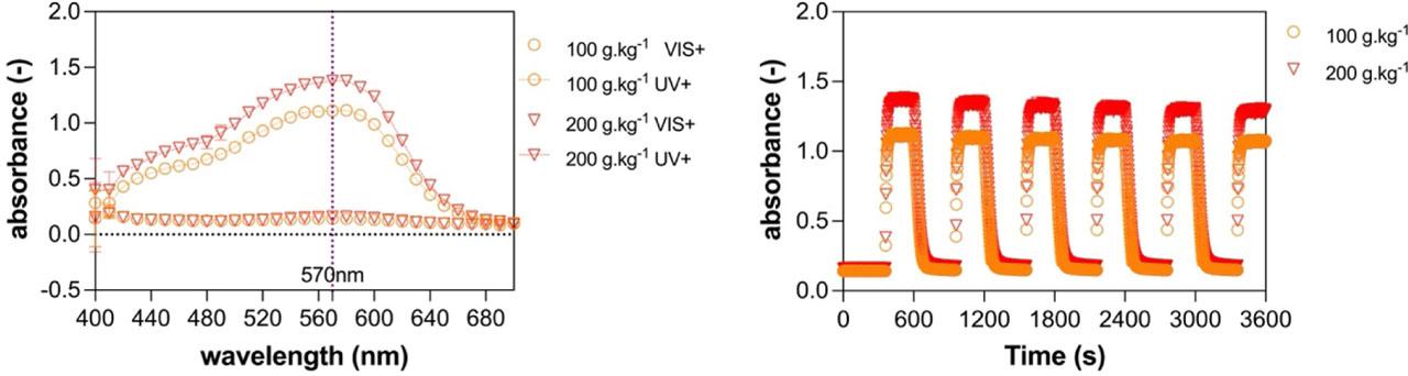 Absorbance curves of photochromic prints and their characteristics of photochromic cycle measurements under continuous UV irradiance