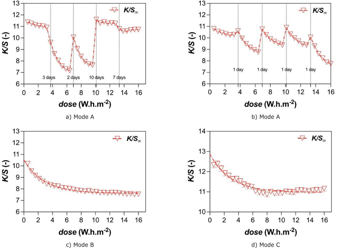 However, we saw a simultaneous increase in colouration and photodegradation in the photochromic system. The assumptions for the cyclic mode say that the UV dosage energy used to break down photochromic devices after each cycle of UV irradiance acts in a way that adds up. Using a smaller number of photochromic cycles in a block mode measurement is not advisable for researching photo-fading behaviour, as it is both intermediate and random. The photochromic system tends to restore molecules that have undergone degradation due to exposure to ultraviolet radiation. The photochromic system with a concentration of 100 g.kg−1 was utilised for three different UV irradiance modes (Figure 3). The photo-fading behaviour of the system after data treatment is depicted in Figures 5 and 6, which show the characteristics of their behaviour over the UV irradiance cycles measured for the three modes. The photochromic system was utilised with a concentration of 200 g.kg−1 for two different UV irradiance modes (Figure 3). We took the measurements 24 hours after each set of UV irradiation cycles to evaluate the photodegradation behaviour. The study included six cycles in five blocks, as shown in Figures 6a) and 6b), with random intermittent measurements and after 24-hour gap measurements (one day gap between consecutive measurements), respectively. The measuring conditions for the other two modes remained unchanged from those stated for 100 g.kg−1 and 200 g.kg−1, as well as their photofading characteristics. The K/S∞ (upper plateau) values for each UV irradiance cycle were determined by fitting the one-phase association model to the raw data at their dominant wavelength. The percentage of photodegradation D K/S (%) of the photochromic system is determined by calculating the difference between the initial (K/S∞) and final (K/S∞) measurements after a series of UV irradiation cycles.