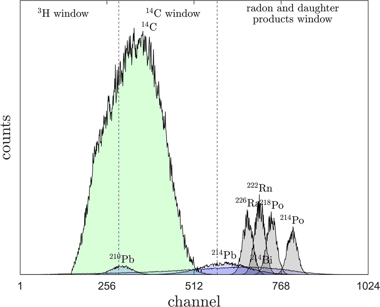 Alpha and beta particle spectra of radioactive nuclides in a Quantulus 1220™ liquid scintillation counter with counting windows used at the Gliwice Laboratory (Poland). In most cases, peak from 210Pb would not be observed in radiocarbon dating due to its low probability.