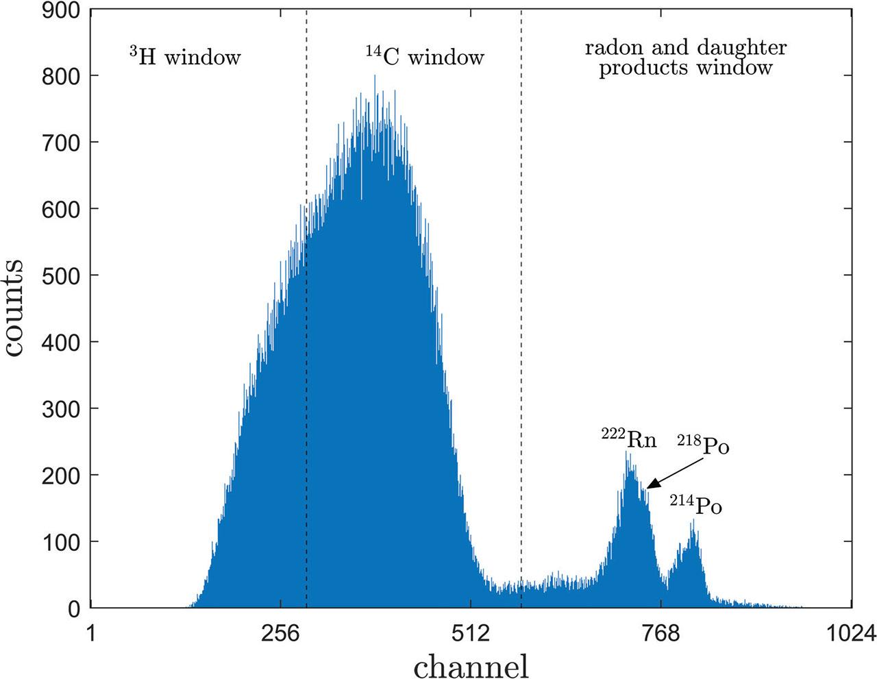 The spectra in the Quantulus 1220™ at the Gliwice Laboratory are divided into three windows, after Tudyka and Pazdur (2010): the 3H window (channels 1–290), the 14C window (channels 291–580) and the radon and daughter products window (channels 580–1024), as shown in Fig. 1.