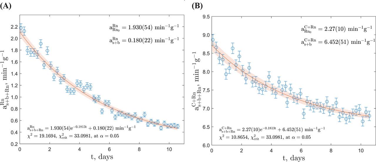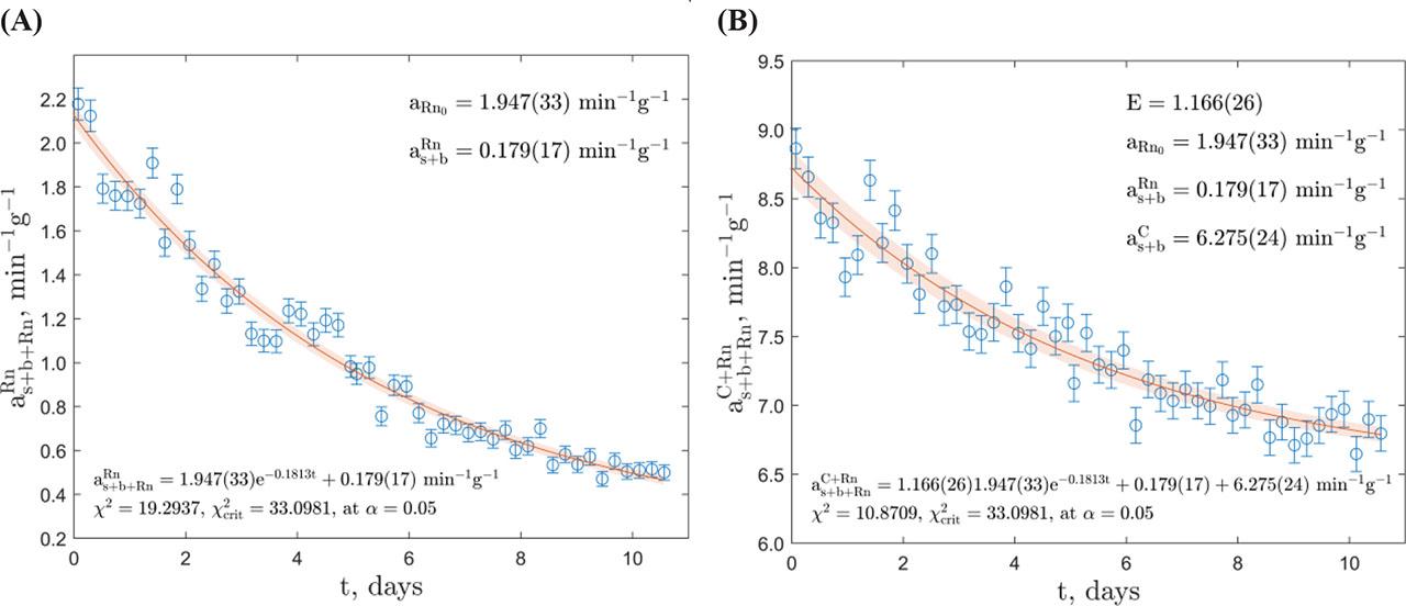 The results of the solved system of equations for the GdS-4657 sample. (A) – Equation corresponding to the radon and daughter products window. (B) – Equation corresponding to the combined 14C and radon and daughter products window. The fitted functions for both equations are shown with a 68.3% confidence band.