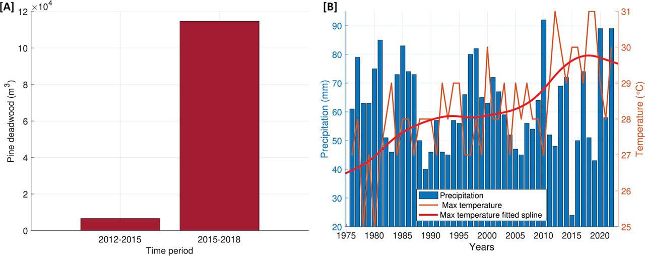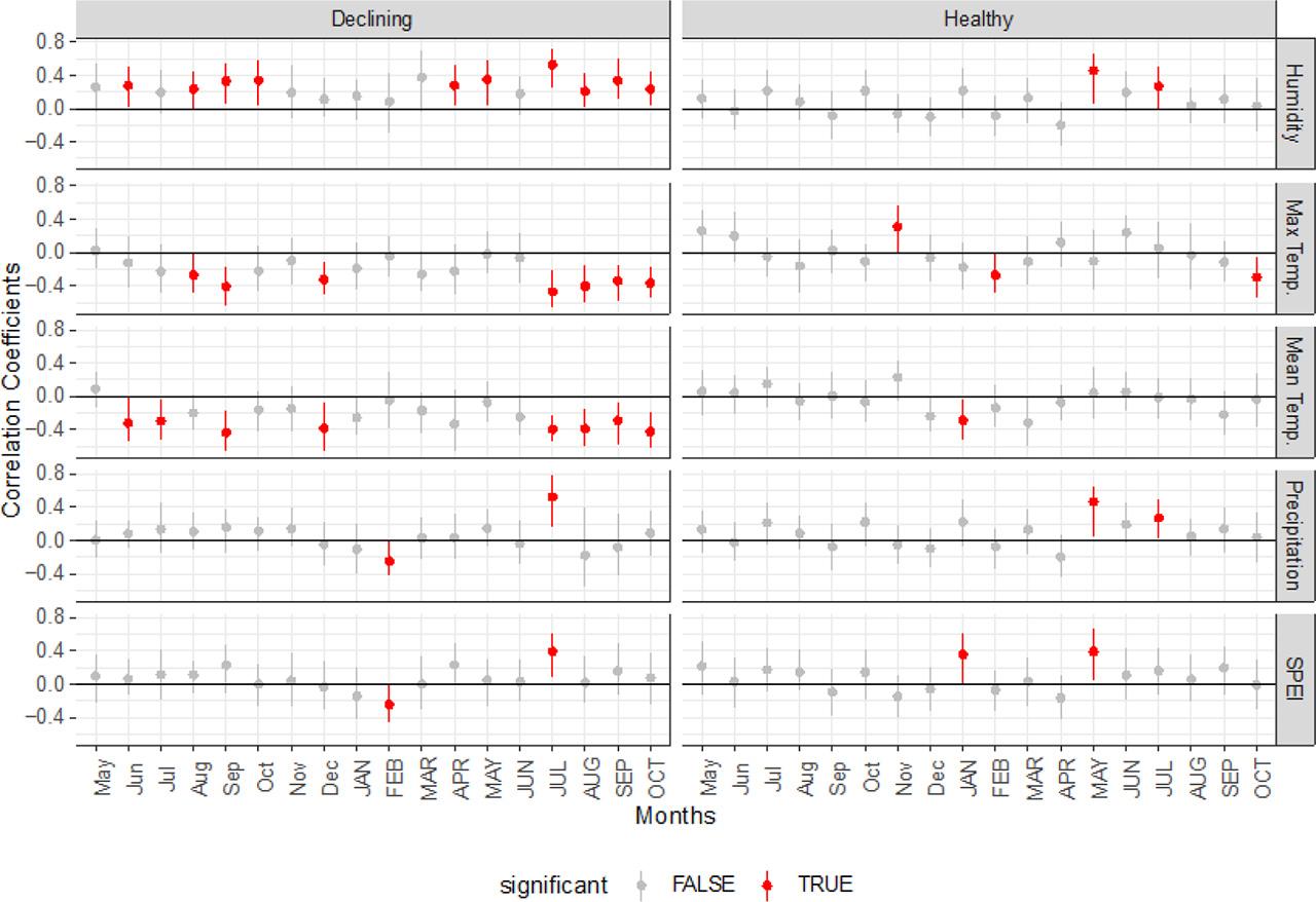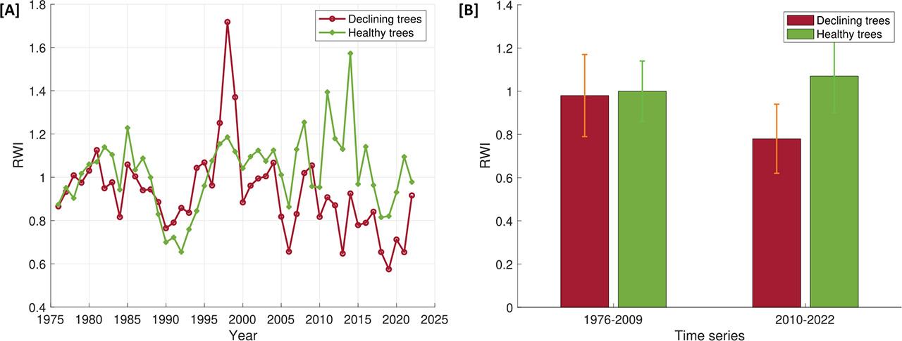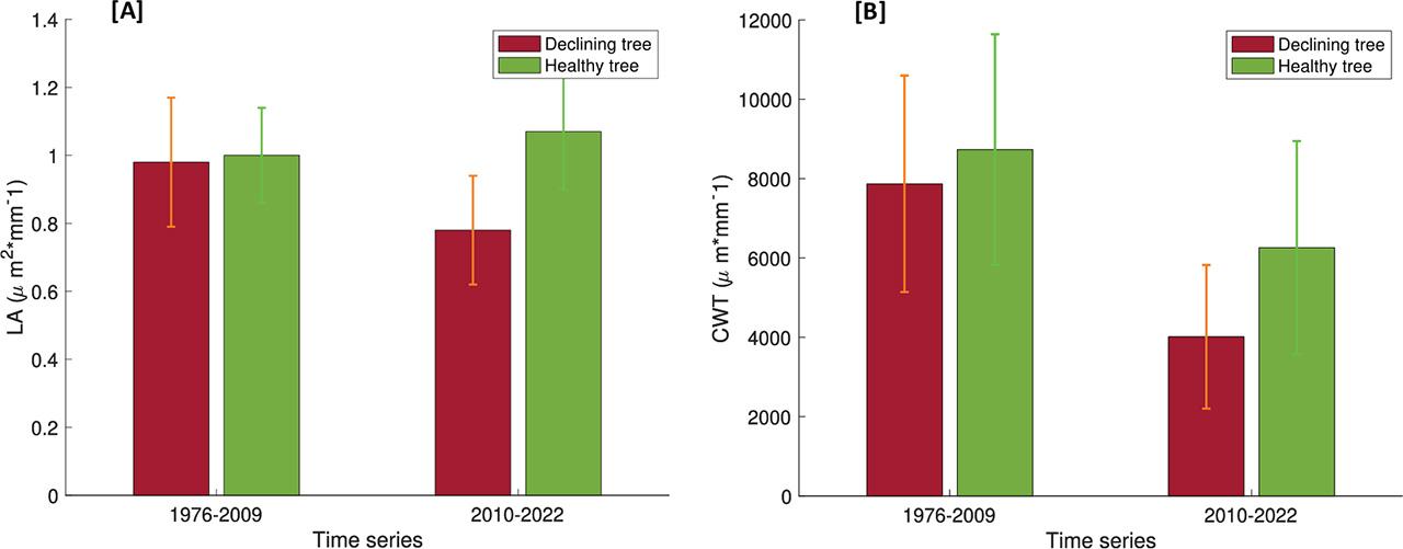 Dendrochronological characteristic with a standard error of declining and healthy groups of trees_