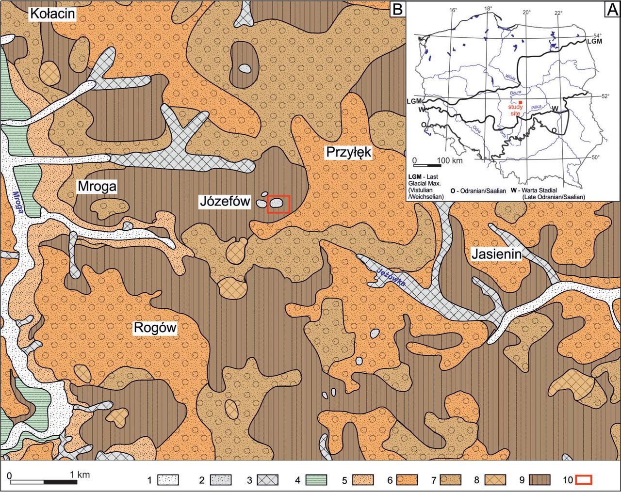 The Józefów site (51°49′59.32″N, 19°53′24.7″E) is located on the Łódź Upland, in the third-rank watershed separating the Mroga and Jeżówka and Rawka river catchments. This area was formed primarily during the Warta Stadial of the Odranian (Saalian) Glaciation (Figs. 1A,B and Table 1) and is dominated by tills, glacial and glaciofluvial sand and gravel (Nowacki, 1993; Trzmiel, 1994) and slope sand and silt, activated by Vistulian denudation processes.