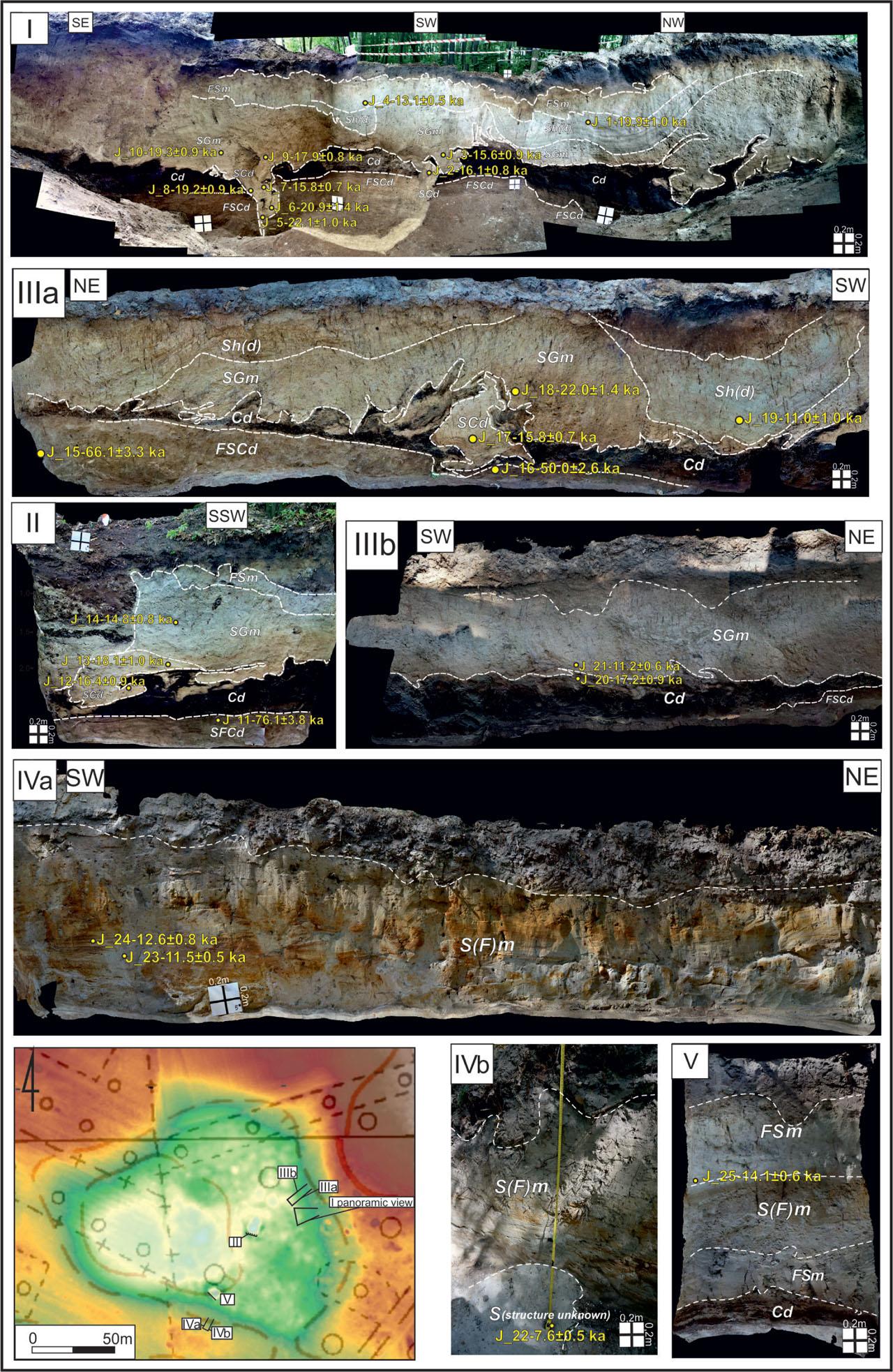 In all outcrops, mineral deposits were distinguished as mineral and organic sediments. Eight lithofacies were distinguished in the sections. The oldest is a mineral-organic silt with sand (FSCd) in the central part of the basin, below 1.5 m to 2.2 m depth (section I, II, IIIa, b, Fig. 2). This layer is 2.5 m thick in the centre and disappears at the edge of the basin (section IIIa). In terms of grain size, these are silty-sandy sediments, with a dominant very coarse silt (28.1%). The admixture of sandy fraction is significant (29.1%), among which very fine sand (22.2%) decidedly predominates, and the admixture of organic parts reaches only 5%. The average grain diameter (Mz) is 4.9 φ and the sorting factor (δ) is 0.0–0.7 φ. At the top, there is a large share of RM (round, mat) quartz-grain processing, reaching even 37% (sample J_11, Table 1). All documented sections exhibit significant deformations of the FSCd layer, resulting from a secondary mixing of silt and sand, originally with horizontal stratification.