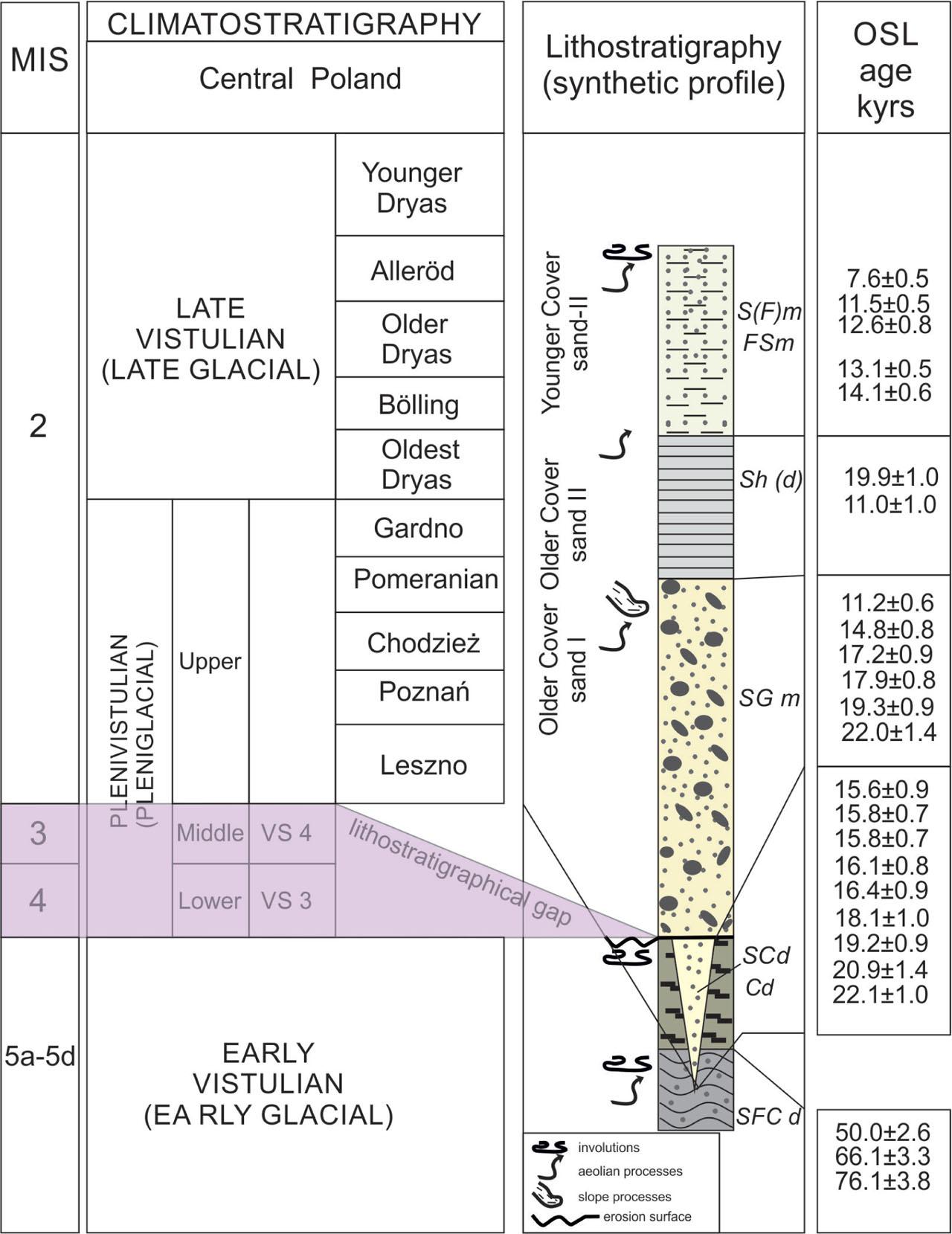 The sequence of sediments begins with lacustrine sediments deposited during the Early Vistulian with traces of cool intervals recorded in aeolian material delivery to the basin. The deformation structures are a record of cryogenic processes in cold climate conditions. A lack of deposits corresponds to MIS 4 and 3 and may indicate that erosion processes dominated here, but they have not been recorded in the sediments.