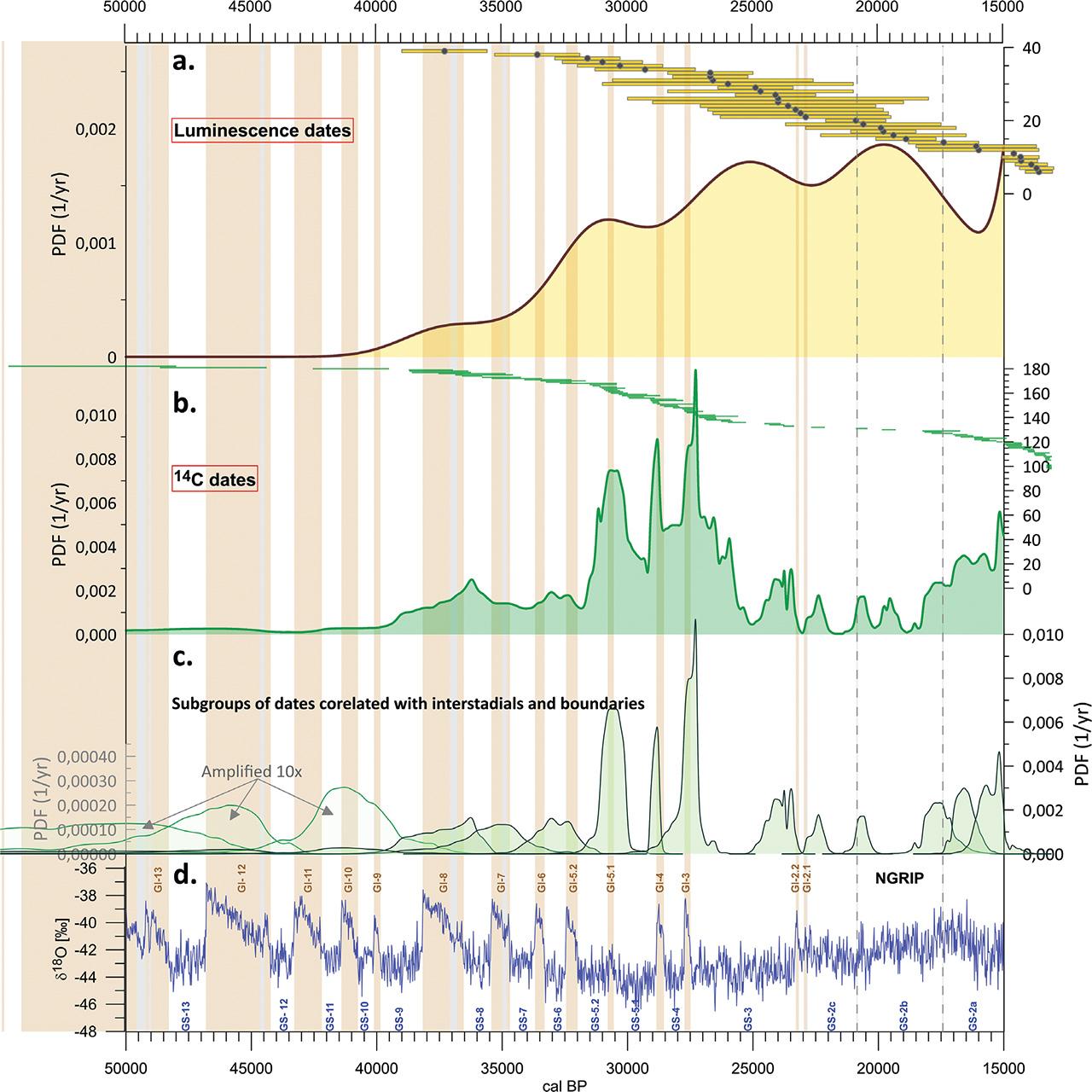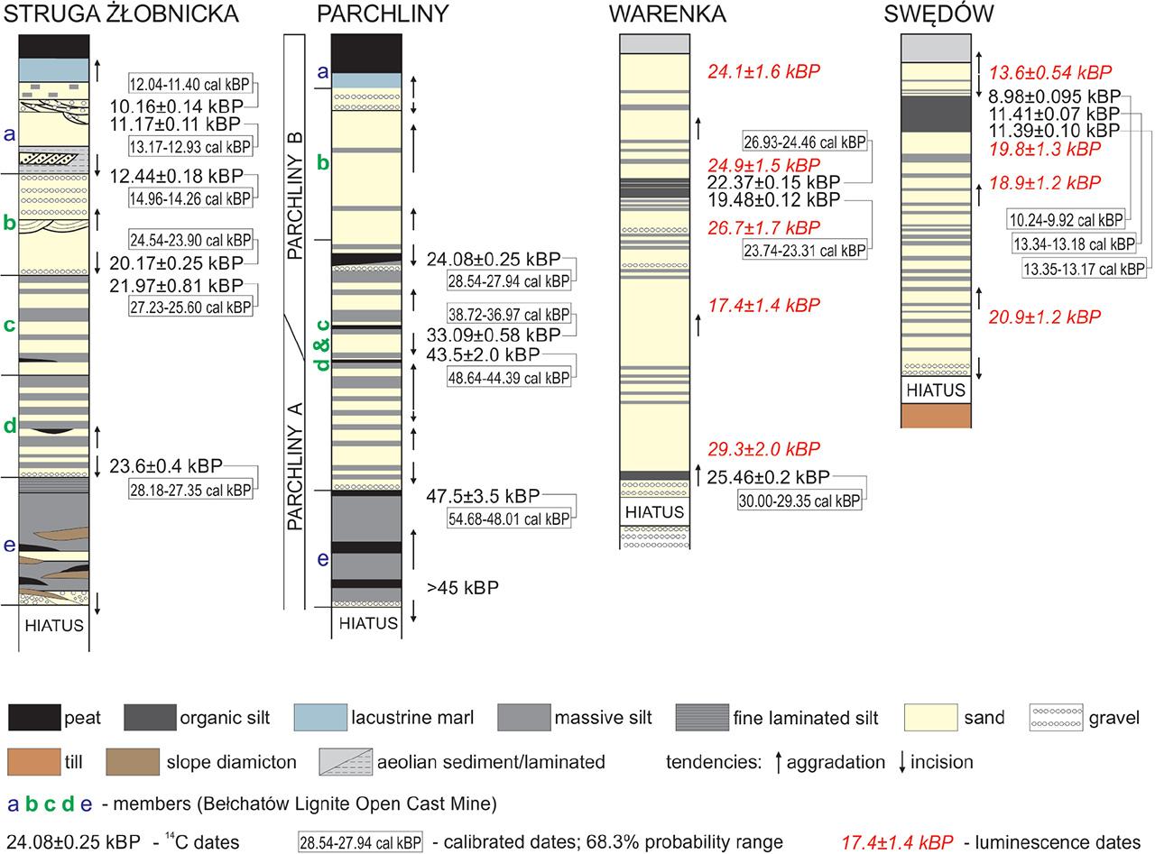 | 154 | 197 | organic deposits | GrN-18147 | 24630 ± 110 | AMS | Kasse C, Huijzer AS, Krzyszkowski D, Bohncke SJP and Coope GR. 1998. Weichselian Late Pleniglacial and Late-glacial depositional environments, Coleoptera and periglacial climatic records from central Poland (Betchatow). Journal of Quaternary Science 13(5): 455–469. |