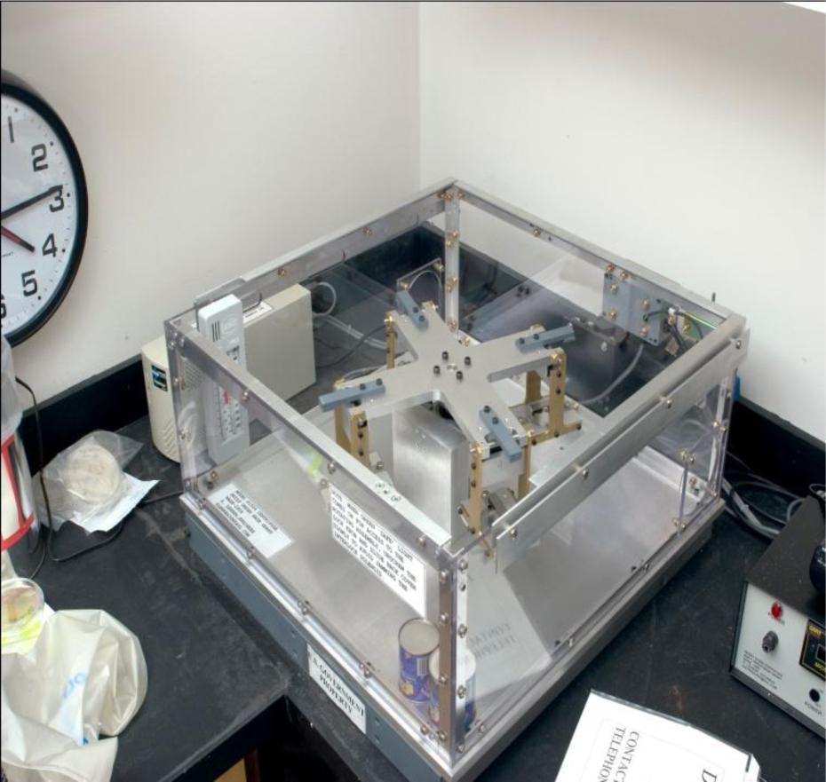 The reduced-g experimental group was rotated on a specially designed clinostat at 5.708 rpm, a speed calculated to simulate reduced-g (Benjaminson et al., 2006), Figure 2. The Model D1003 clinostat was designed and manufactured by Lehrer Engineering, Pompton Lakes, New Jersey. The reduced-g simulation is obtained by slowly rotating the clinostat disk holding the experimental cultures. Earth’s gravity vector with respect to the specimen is averaged out to approximately zero over each revolution of the disk. The rotational speed is sufficiently low (0.1 to 5.7 rpm) so that the effect of the centrifugal force induced by the rotation is essentially zero. The reduced gravity equals 0.0058 g at 5.7 rpm. The controls for this portion of the experiment were stowed in the clinostat’s upright U-shaped bracket alcove.