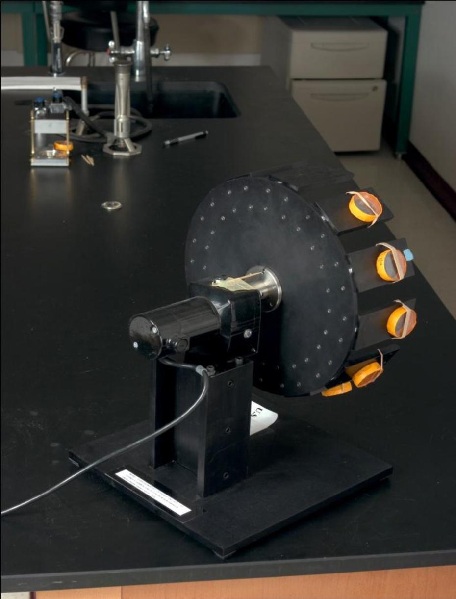 The D1003 clinostat viewed from above showing the rotor assembly with culture and the upright U-shaped bracket alcove.