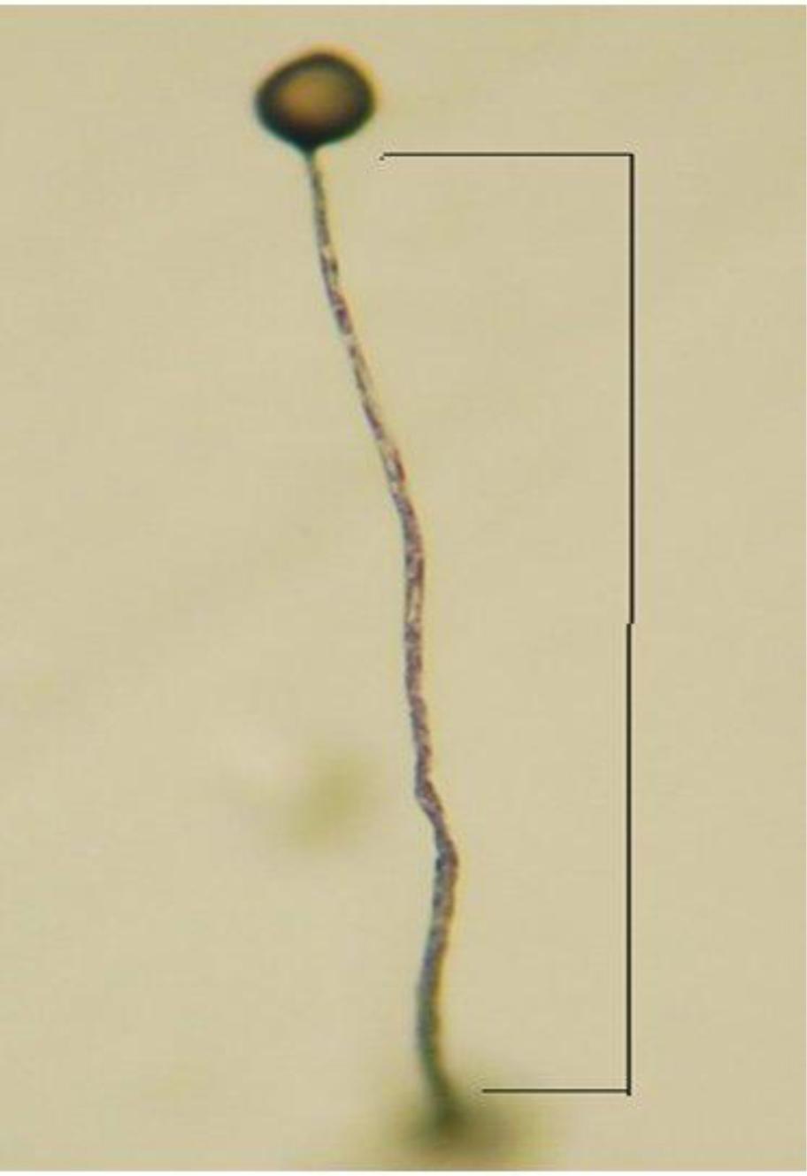 A rendition of a mature sorocarp showing the base, stalk, and fruiting body. The bracket delineates the measurement target.