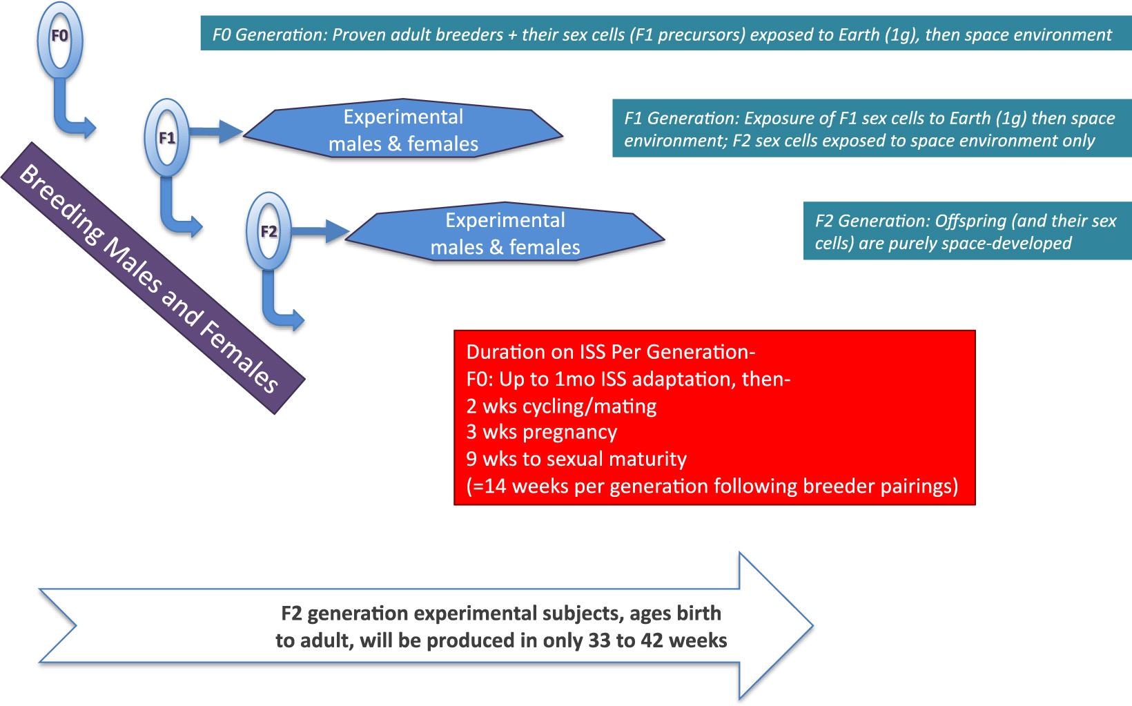 Multigenerational Timetable and Earth/Space Exposures. If F0 (parents) are bred on ISS, the first totally space-adapted organisms (and their germ-cell lines) will be the F2 generation.