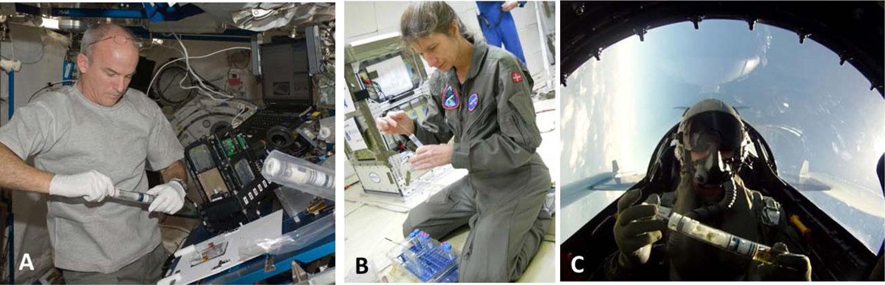 Operational molecular biology in spaceflight and spaceflight-related environments. (A) Astronaut Jeff Williams at the Multipurpose Work Area of the ISS, harvesting arabidopsis from our petri plates and fixing them in RNAlater in a KFT. (B) Anna-Lisa Paul harvesting during a NASA Flight Opportunities parabolic flight. (C) Robert Ferl activating KFT during F104 flight.