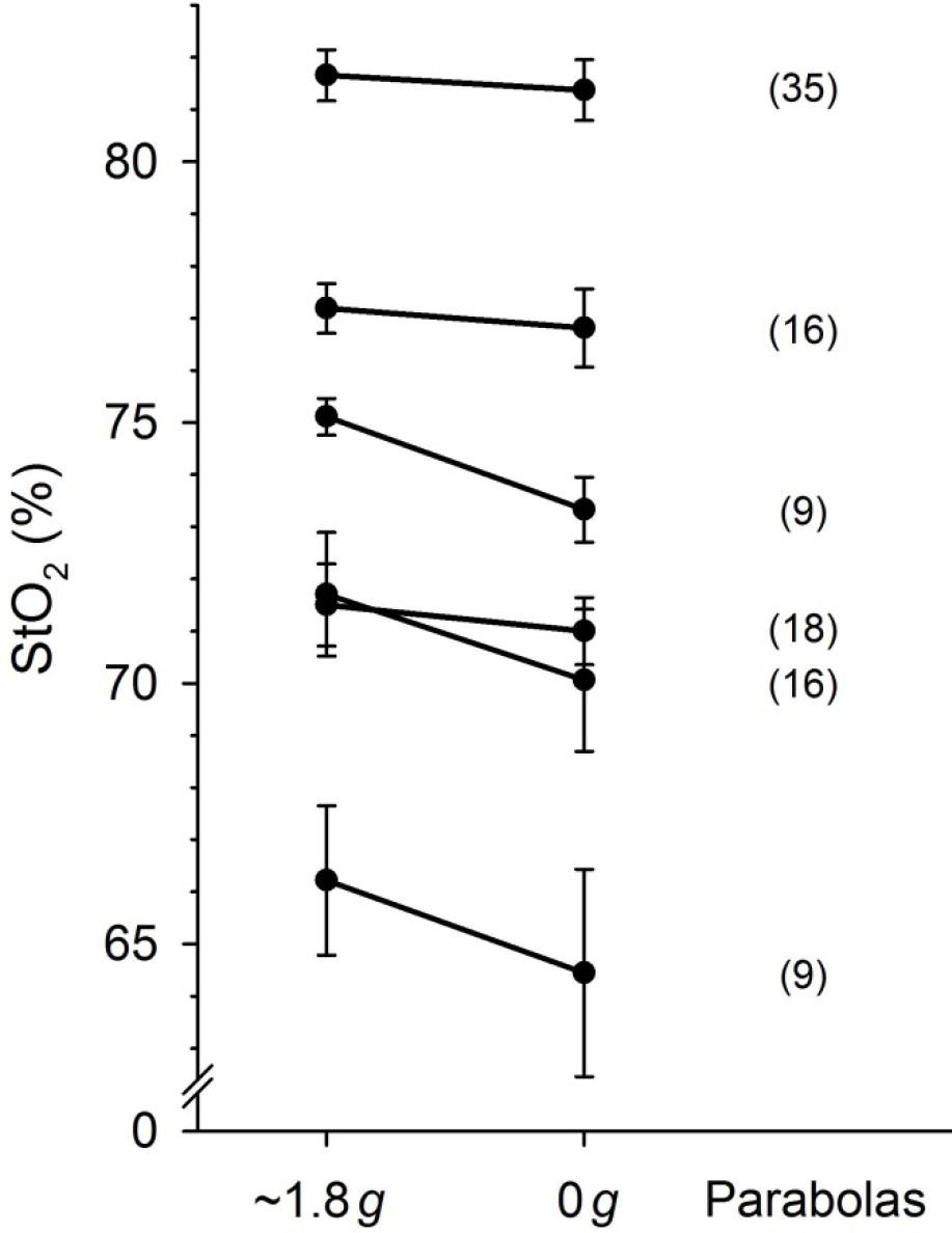 In the course of assessing this technology we obtained data on StO2 during changing gravity conditions. This data is preliminary in nature and the usual limitations of parabolic flights apply, including a small sample size, short exposure times, and the potential for physiological effects of one phase (microgravity or hypergravity) to carry over into the subsequent alternate phase. Notwithstanding these limitations and the background variability, across multiple repeat measurements a small fall in StO2 was observed in each individual on transition to microgravity. Such a small decrement has no physiological significance in itself, and an artifactual explanation cannot be excluded, but it is interesting to speculate whether this fall might represent the beginning of a larger effect of microgravity on tissue oxygenation that would have continued to develop had the weightless state been maintained beyond 17 seconds.