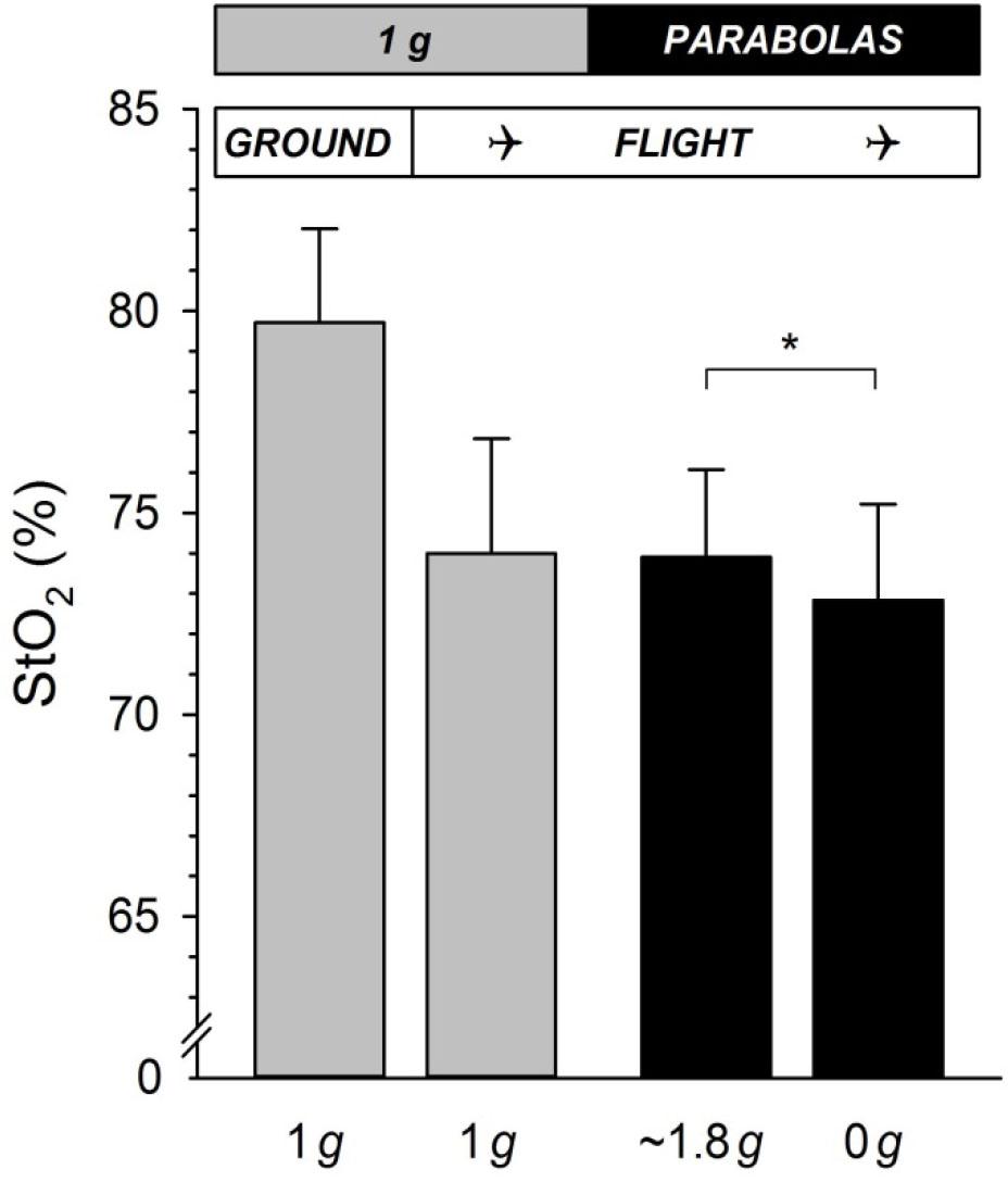 Tissue oxygen saturation (StO2) during parabolic flights. Thenar StO2 is shown (mean ± SEM). In-flight measurements were made at a constant cabin pressure altitude of 5,600 ft (1,700 m). Pre-flight and in-flight data recorded at 1 g are shown in grey, and microgravity/hypergravity data during parabolas are shown in black. The asterisk denotes a statistically significant change in StO2 upon transition from hypergravity to microgravity.