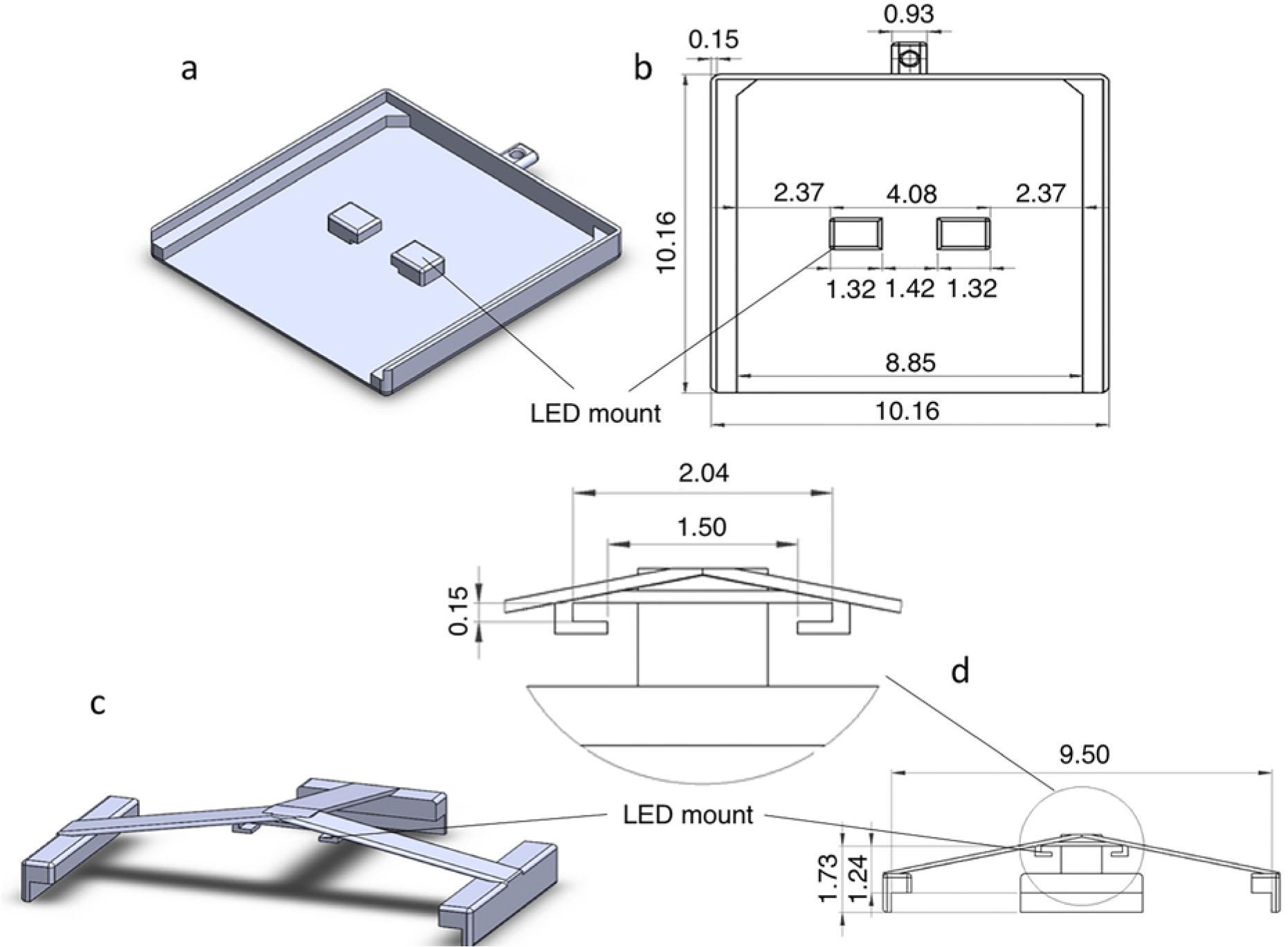 (a–b) Initial prototype Petri dish cover design holds a single far-red LED over the center of a 10 cm×10 cm Petri dish using the integral clips. Wiring from the LED wrapped through the tab in the back allowing for a user to remove the entire LED assembly from a Mylar bag that was used to provide a dark environment for the Petri dish after irradiation. (c–d) Second prototype ‘pyramid’ design that held a single far-red LED over the center of a 10 cm×10 cm Petri dish, but allowed for increased convective air flow. All dimensions are in cm.