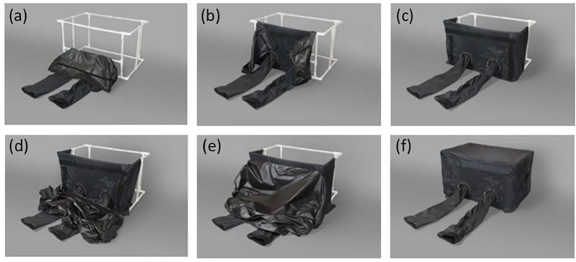 In order to assemble the canopy of the tent, the front piece of fabric is wrapped around the user-facing side and the top bar is then Velcroed to itself as shown in Figure 2a. The front piece of blackout fabric is pulled taught around the left and right corners and Velcroed to the top right and left PVC bars as shown in Figures 2b and 2c. The top panel is then Velcroed to the front panel (Figures 2d and 2e). Pulling the top panel taught, the user can then fold the right and left panels around to Velcro onto the front piece of fabric as shown in Figure 2f. Access is available from the back of the frame, as the blackout material at the back is not attached to the PVC in this region. Once all materials for the experiment are loaded into the tent, the back is draped down the frame with the extra laying on the lab bench and making a light-tight seal to the bench surface.